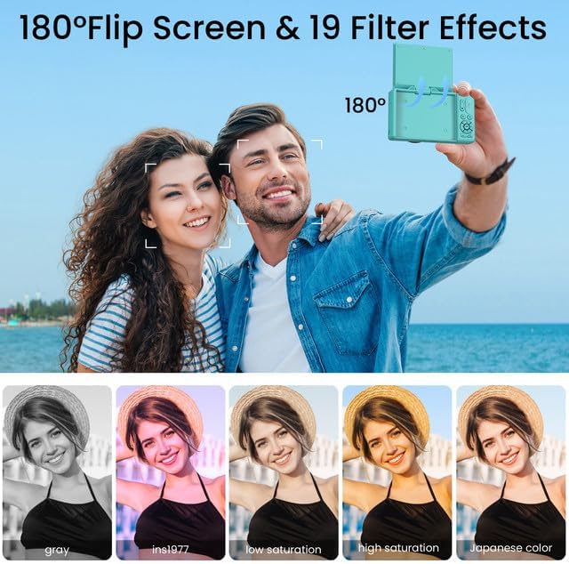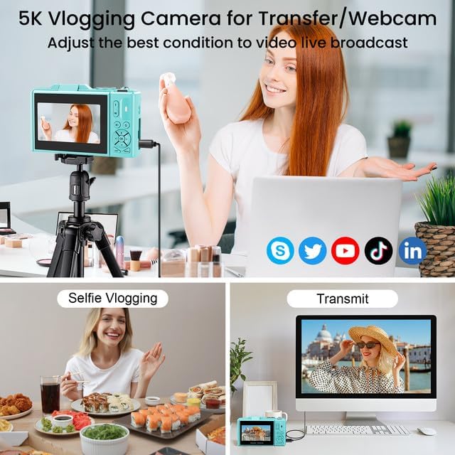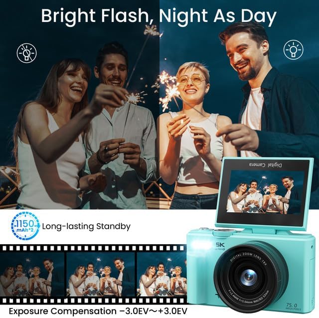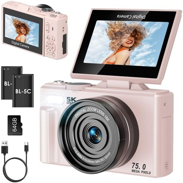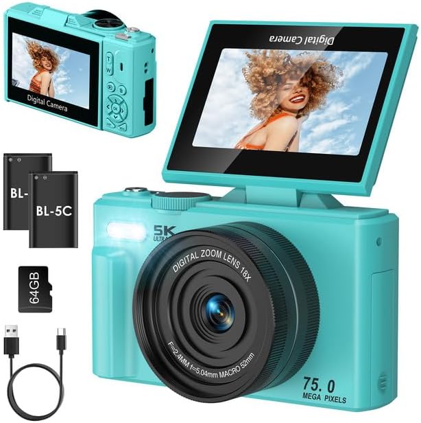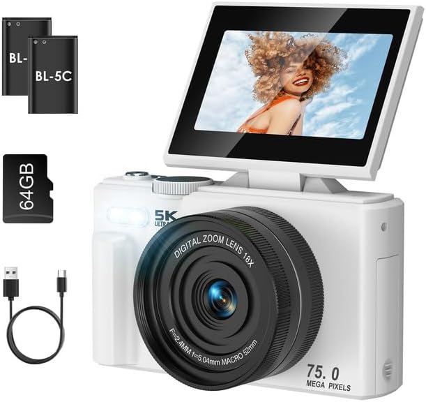 • UHD 5K и 75MP цифрова камера с 64GB SD карта: камерата за влогване за YouTube може да прави 75MP изображения и да записва видеоклипове с резолюция 5K. 3-инчовият ултра ясният екран поддържа завъртане на 180°, което улеснява селфитата и блогването. Цифровата камера предлага селфита, функция за видео пауза, запис по време на зареждане, запис на забавен каданс и непрекъснато снимане, което е по-добро от конвенционалните камери.