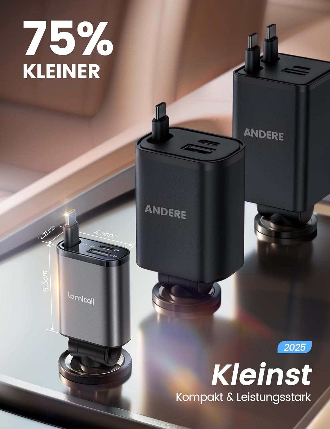 Lamicall 3-в-1 USB C зарядно за кола с кабел за запалка - 【2025 Super Compact】50 W USB адаптер за бързо зарядно за кола с прибиращ се кабел тип C/USB C/USB A, 24/12 V зарядно за кола за iPhone/Samsung