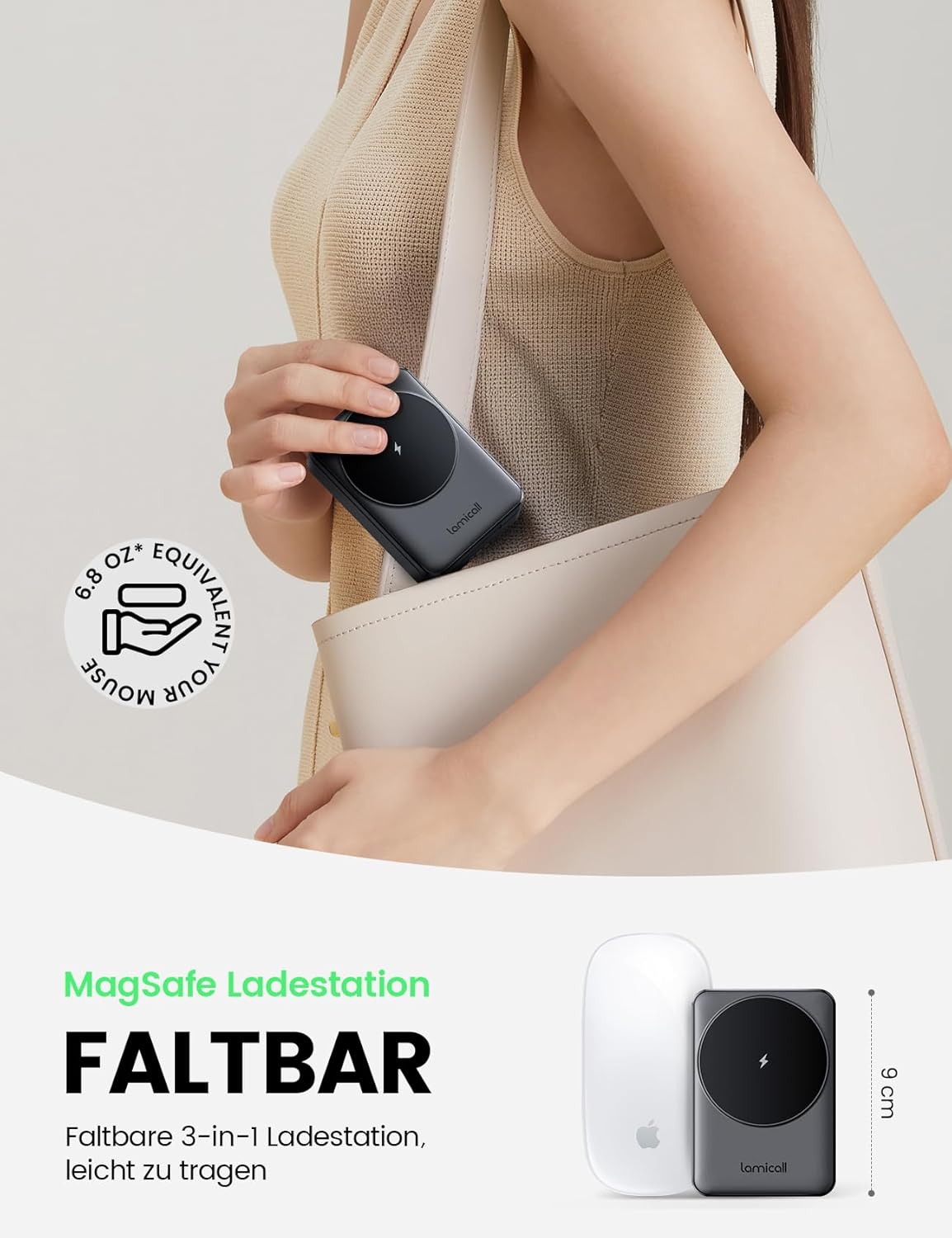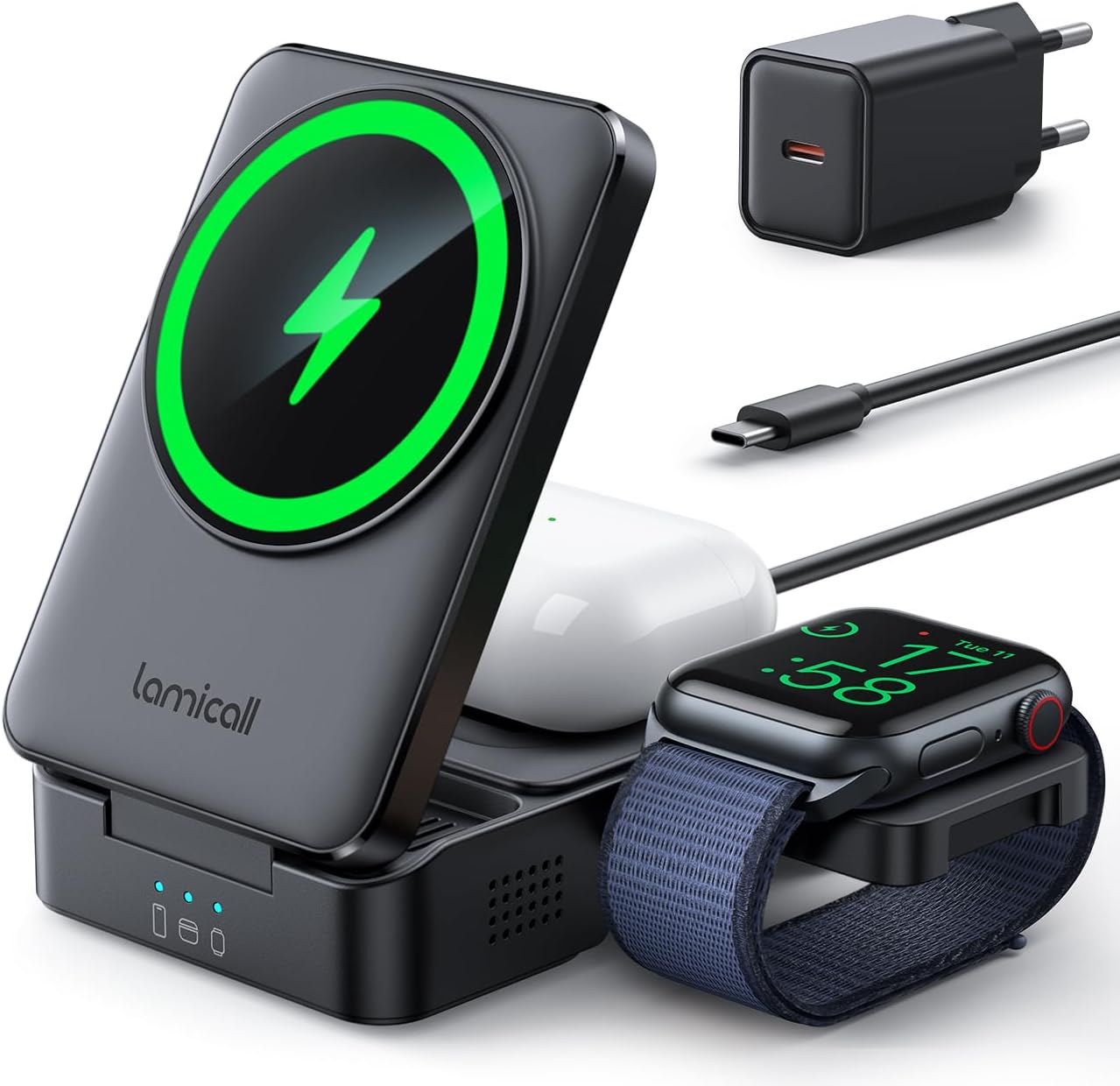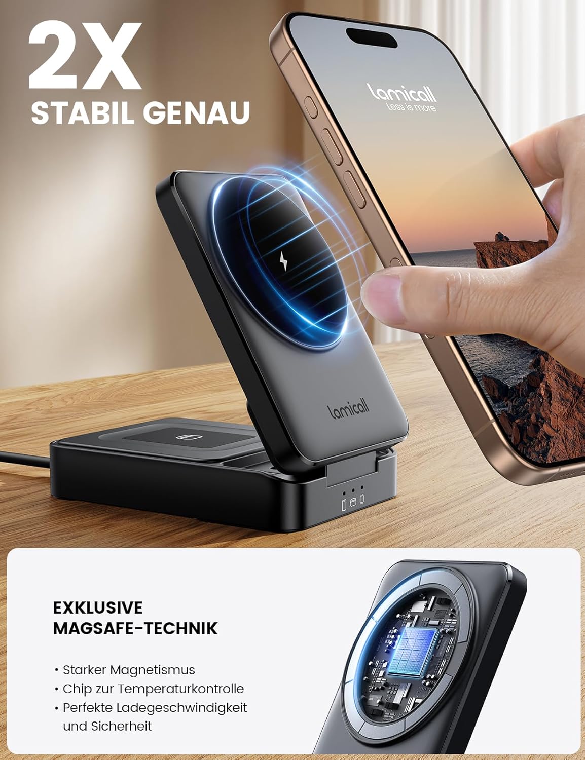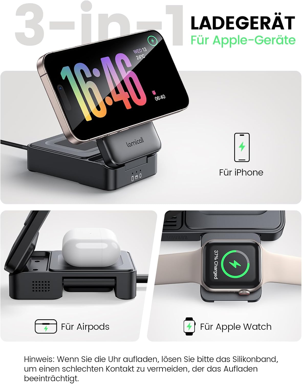 • Съвместими устройства: Зарядната станция Lamicall за MagSafe е подходяща за iPhone 17, 17 Pro, 17 Pro Max, 17 Air, iPhone 16/15/14/13/12/11 серия, iPhone 8, 8 Plus, iPhone X, XR, XS, XS Max; Apple Watch Ultra/Ultra 2, S9, S8, S7, S6, SE, S5, S4, S. 3; 3; AirPods Pro/3/2 (версия с калъф за безжично зареждане). Съвет: моделите преди серията iPhone 11 трябва да имат калъф MagSafe. Съвет: Моля, разхлабете каишката, когато зареждате часовника, за да избегнете лош контакт, който може да повлияе на процеса на зареждане.