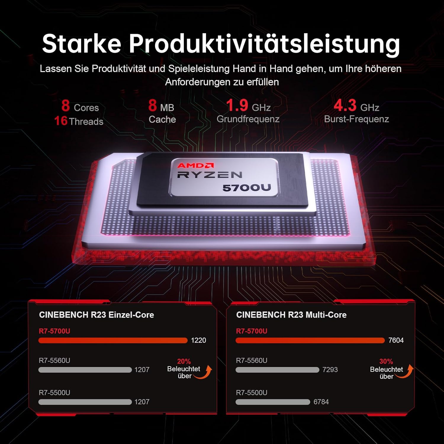 • Процесор Ryzen 7 5700U: Лаптопът AX16PRO е оборудван с мощния процесор Ryzen 7 5700U, мощен мобилен процесор, базиран на микроархитектурата "Zen 3", предназначен за тънки и леки лаптопи и ултрабуци. Той съчетава отлична ефективност с консумация на енергия, 8 ядра и 16 нишки, както и максимална честота на ускорение от 4,5 GHz. Превърнете лаптопа си в мултитаскинг, тъй като той ви дава производителността, необходима за игри с високи FPS, и ви позволява лесно да продължите да изпълнявате взискателни многозадачни задачи като редактиране на видео, музика и снимки.