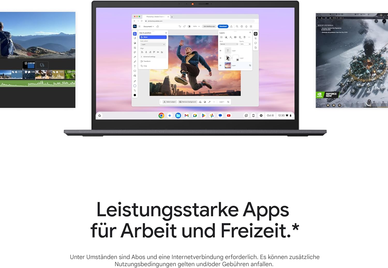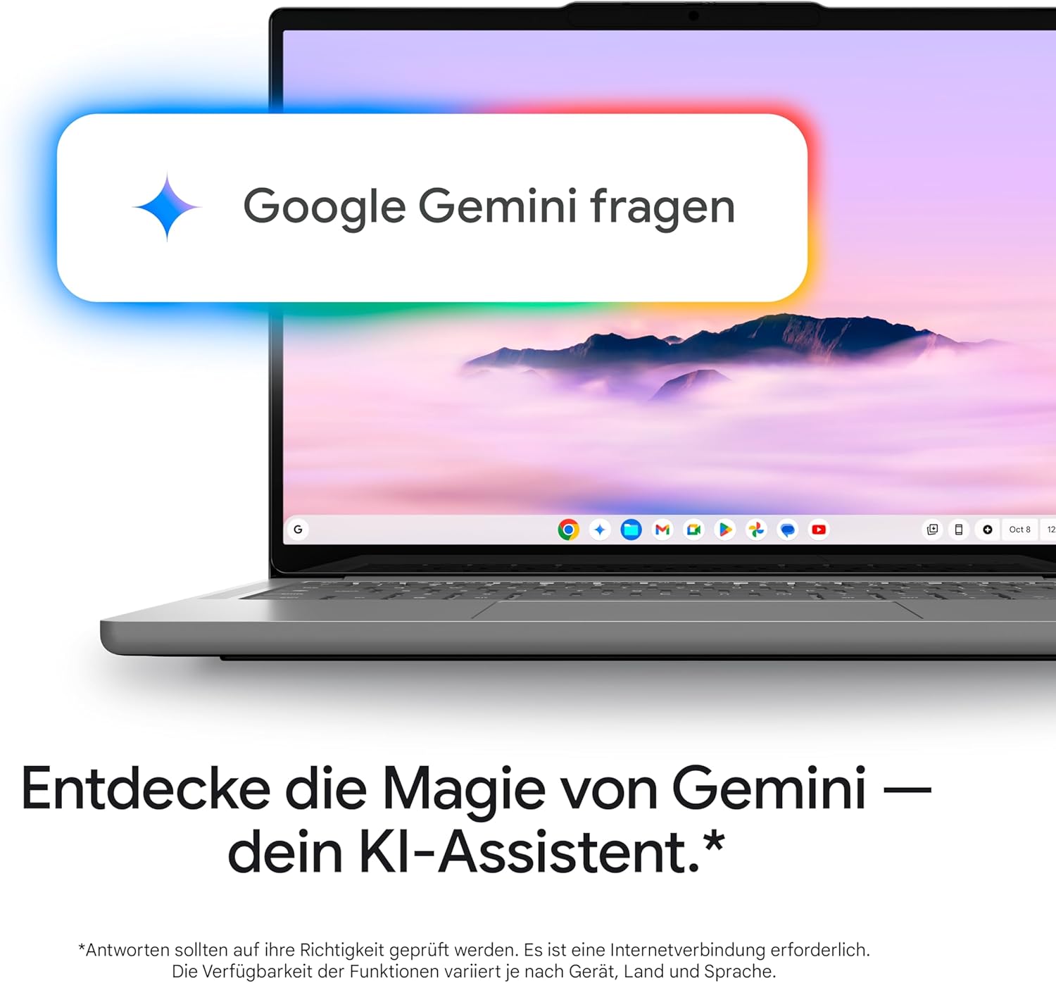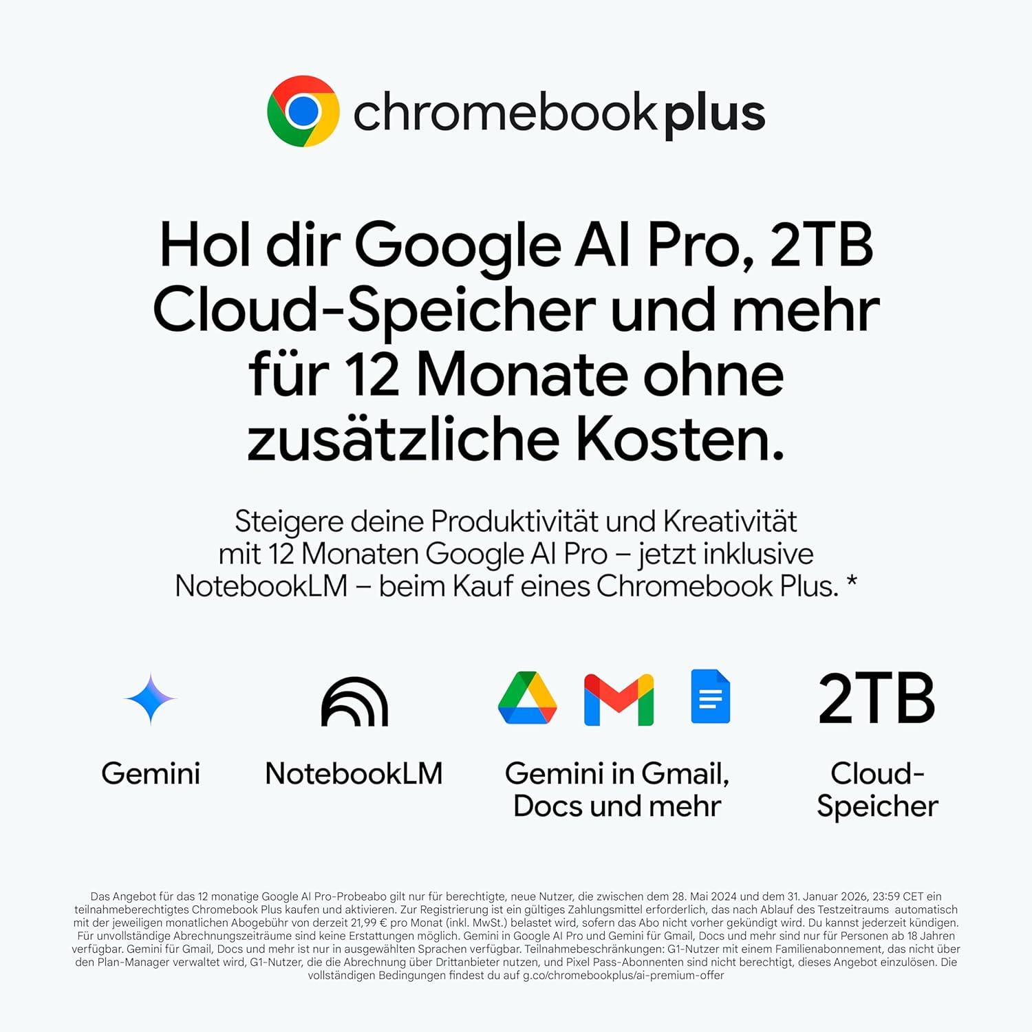 • С покупката на Chromebook Plus получавате 12-месечен абонамент за Google One AI Premium, който включва достъп до Gemini Advanced, 2 TB облачно хранилище и други. За повече информация относно промоцията посетете one.google.com/offer/terms-and-conditions/chromebookplus