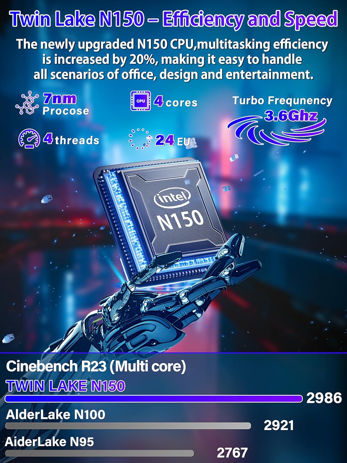 • 【Бърз и модерен процесор – Alder Lake N150】: С 4 ядра и 4 нишки и Turbo Boost до 3.6 GHz, Celeron N150 е приблизително 17% по-бърз в едноядрена производителност от популярния N100. Независимо дали използвате офис, сърфирате, провеждате видеоконферентни връзки или гледате YouTube, ще се възползвате от по-бързо зареждане и по-плавна работа.