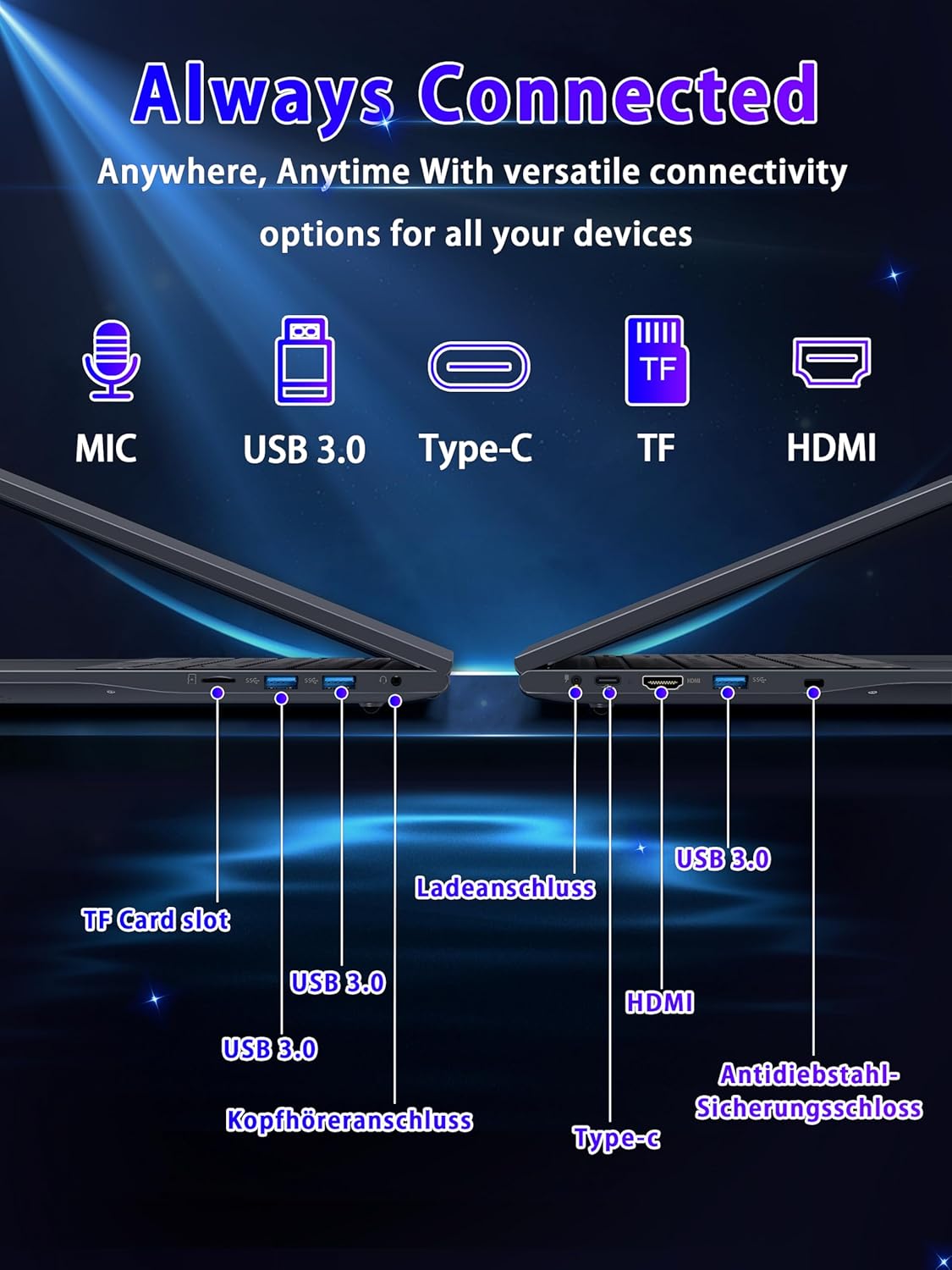 • Универсални портове и модерна свързаност. Лаптопът разполага с USB-C, HDMI, USB 3.0, четец на TF карти и жак за слушалки – идеални за свързване на всички ваши периферни устройства, от външни монитори и дискове до аудио устройства. Двубандовият Wi-Fi (2.4 и 5 GHz) гарантира бързи и надеждни връзки, независимо дали става въпрос за взаимодействие в реално време в онлайн класове или за безпроблемно стрийминг на Full HD/2K съдържание.