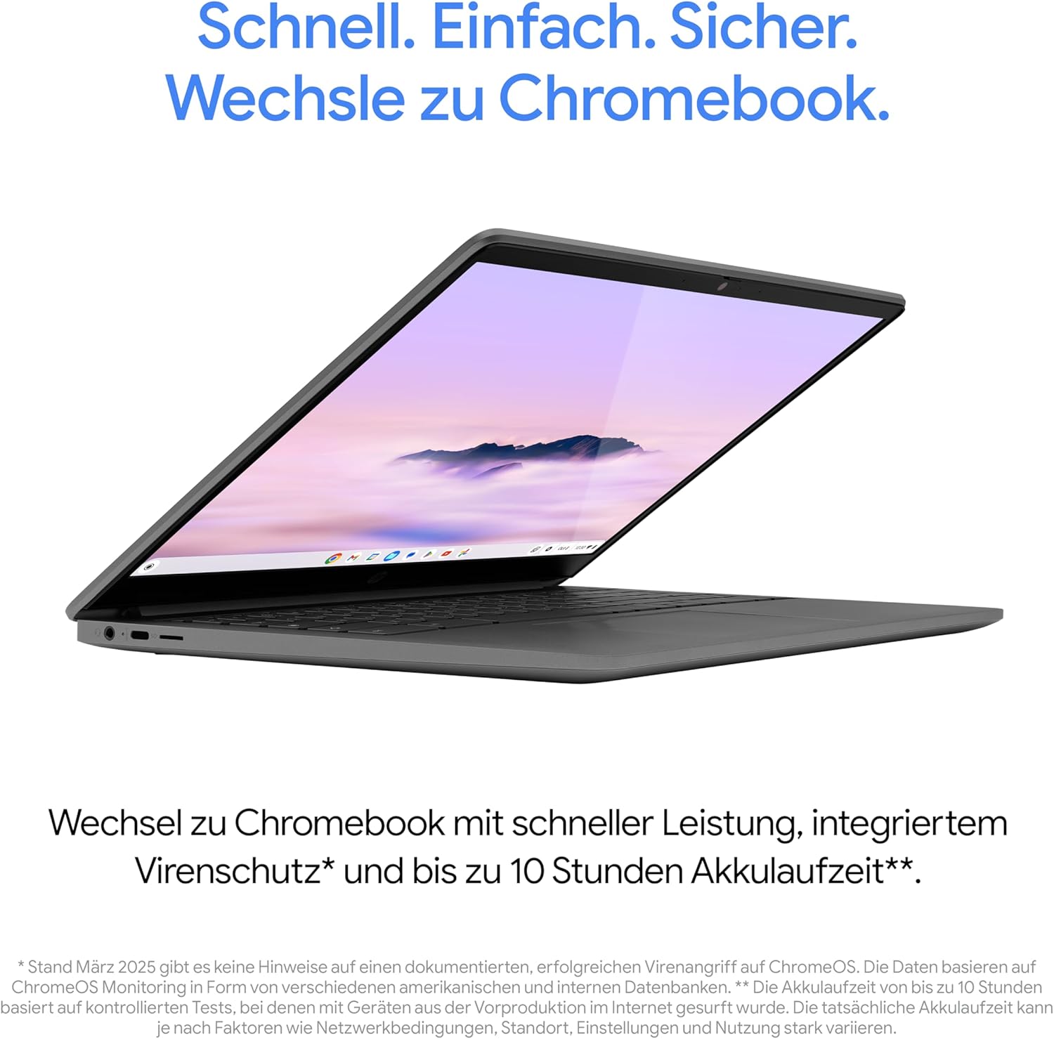 • Chromebook-овете работят с ChromeOS, бързата и сигурна операционна система на Google. Това устройство е проектирано да работи на тази операционна система за оптимизирана производителност и сигурност. Просто влезте с профила си в Google за незабавен достъп до вградените приложения на Google Workspace, като Документи и Таблици.