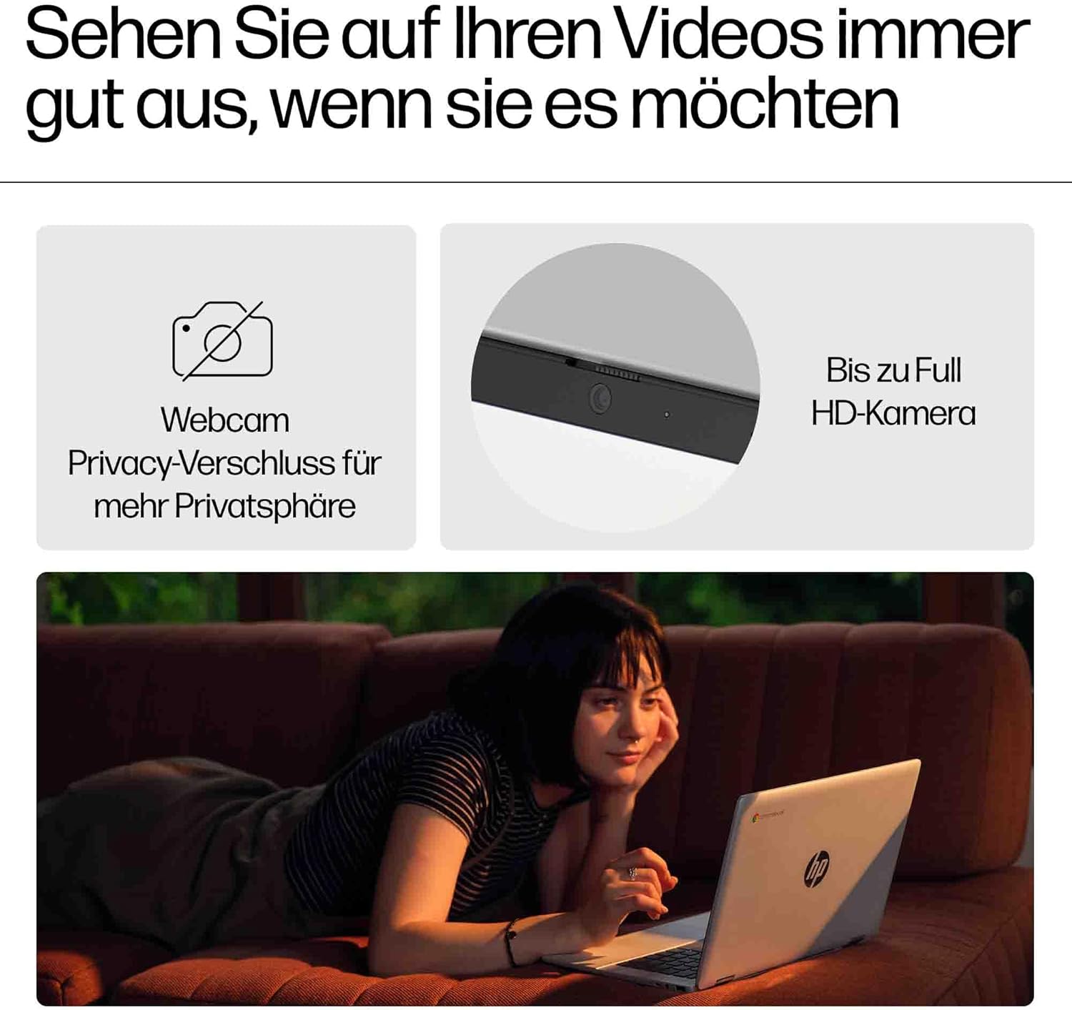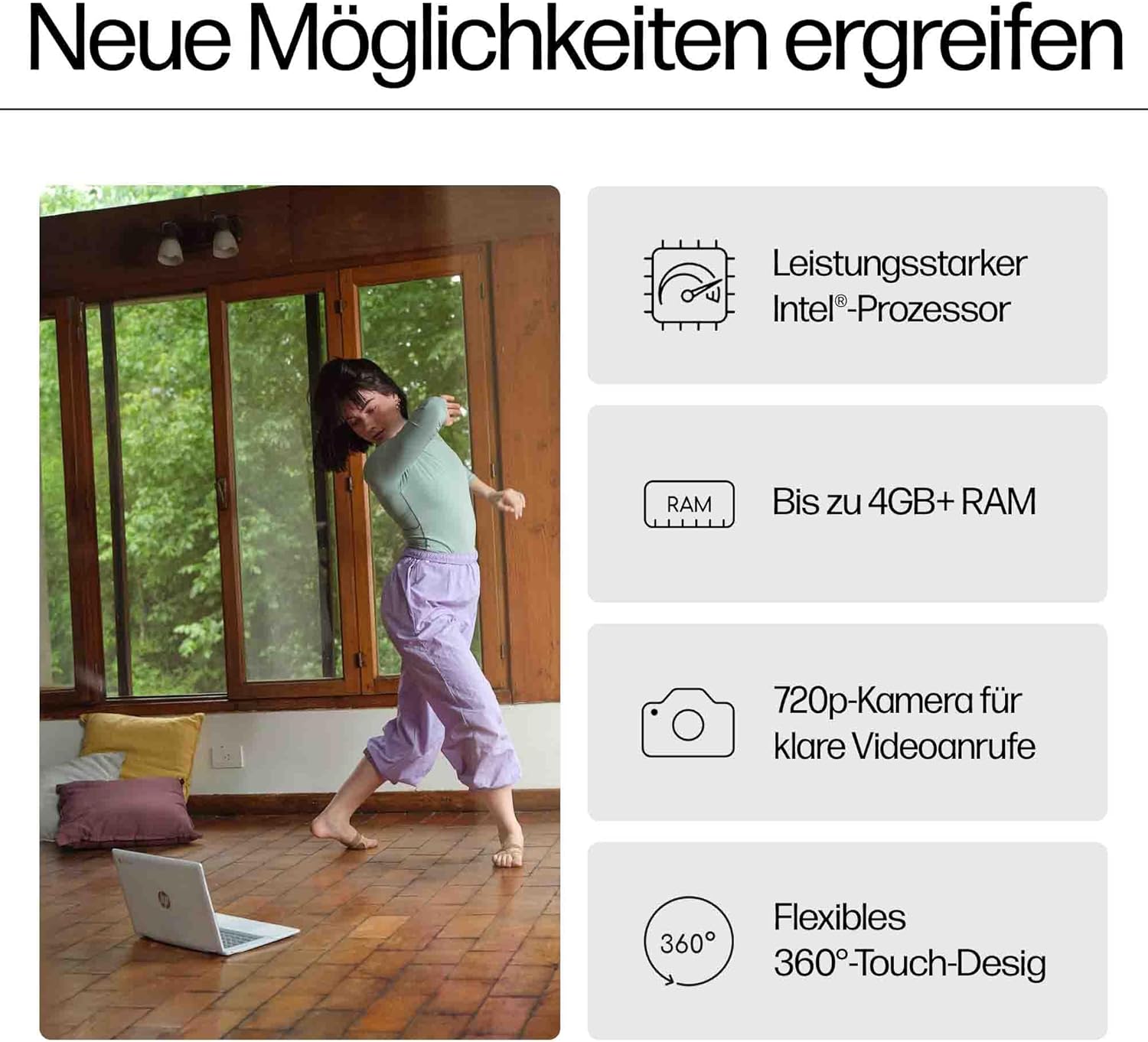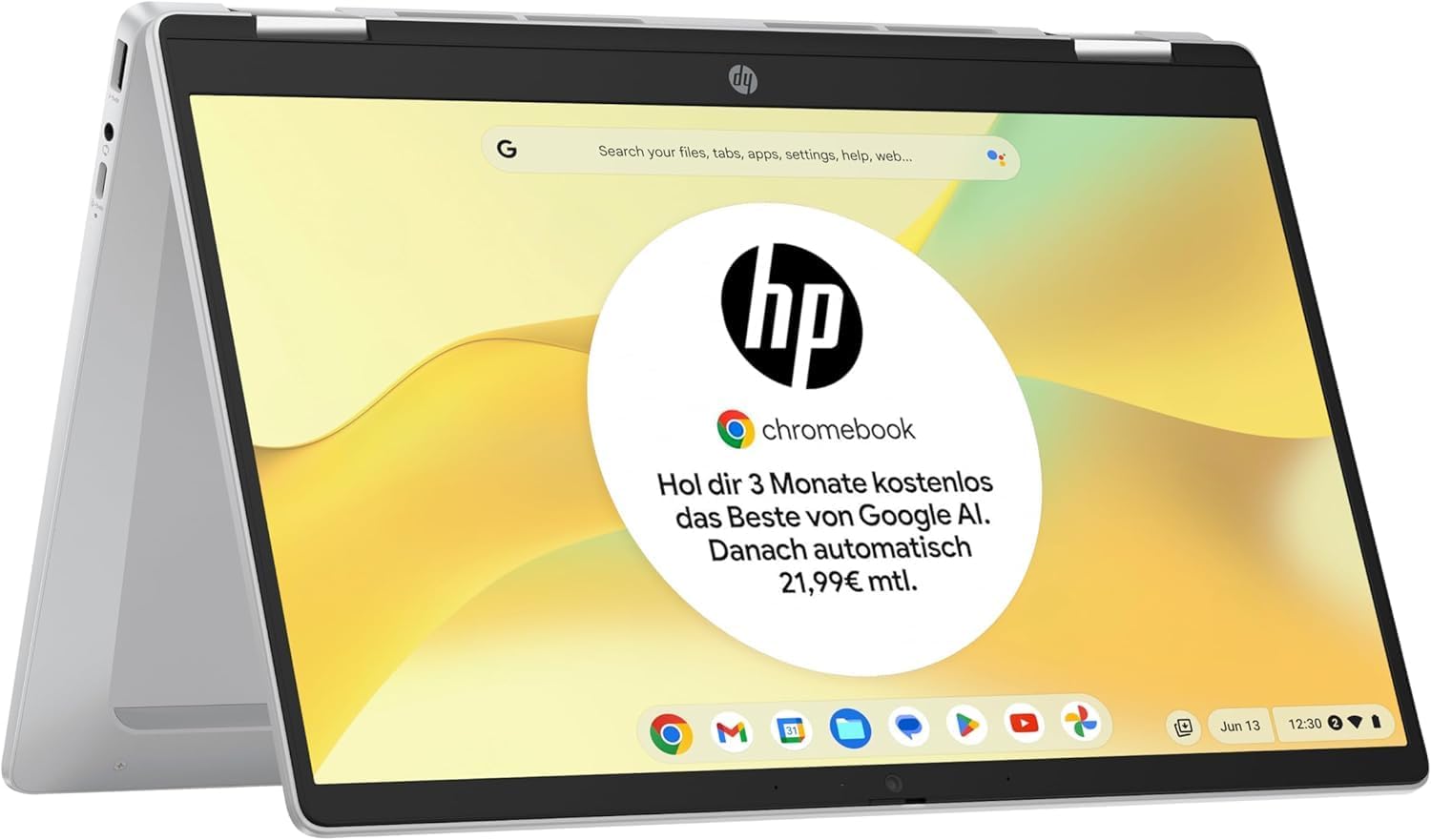 Лаптоп HP Chromebook x360, 14" сензорен екран, процесор Intel N100, 4 GB DDR4 RAM, 128 GB eUFS, Intel UHD Graphics, операционна система ChromeOS, QWERTZ клавиатура, Gemini, сребрист
