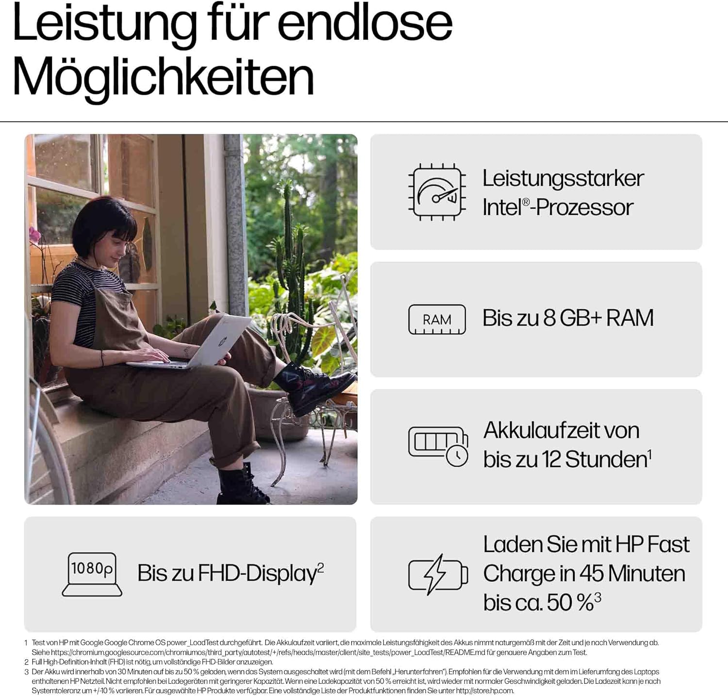 Лаптоп HP Chromebook x360, 14" сензорен екран, процесор Intel N100, 4 GB DDR4 RAM, 128 GB eUFS, Intel UHD Graphics, операционна система ChromeOS, QWERTZ клавиатура, Gemini, сребрист