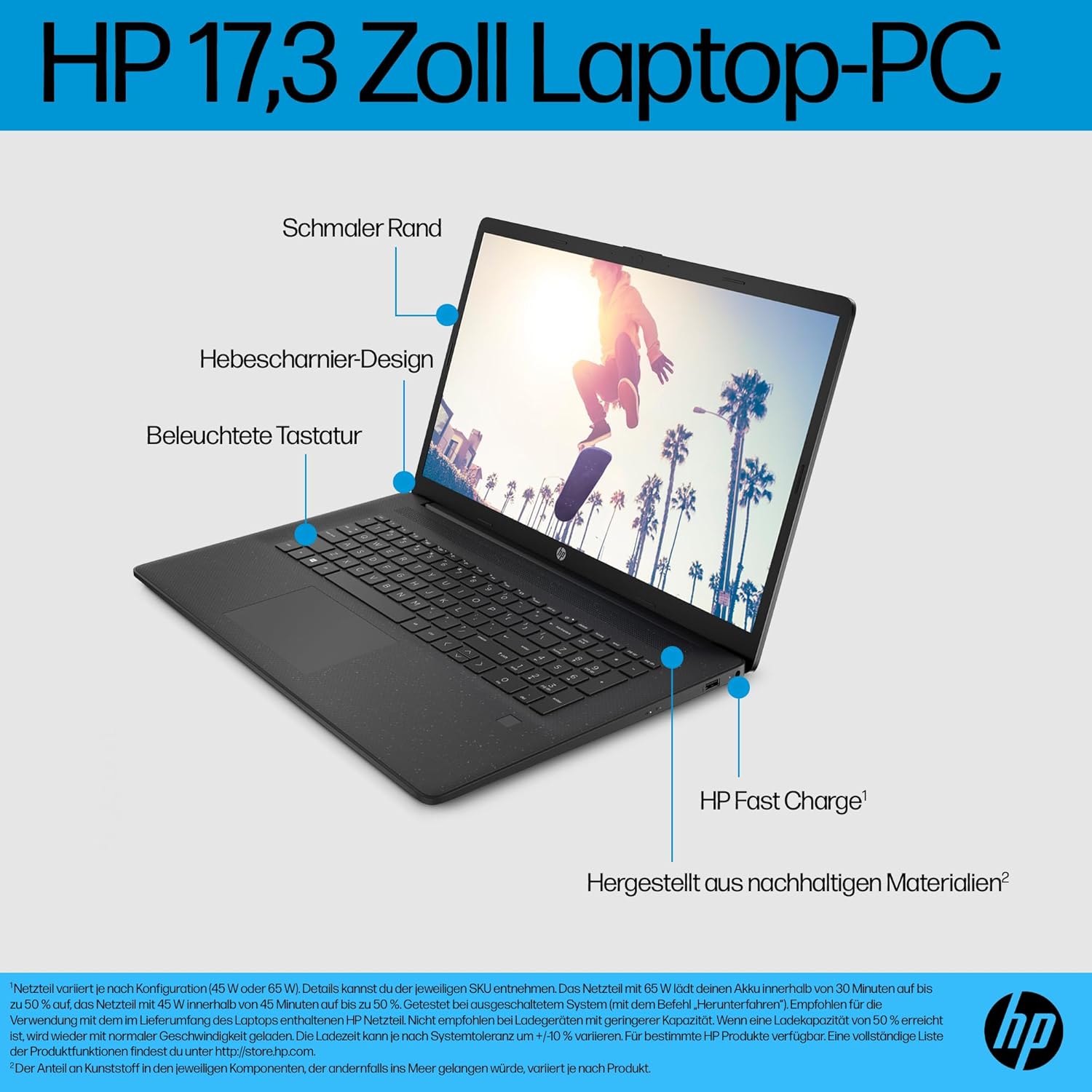 17,3-инчов лаптоп с голяма визия за бъдещето. 17,3-инчовият лаптоп на HP предлага изтънчен дизайн и високата производителност на AMD процесор, бърз Wi-Fi и щедро място за съхранение. Насладете се на по-естествена и удобна позиция за писане с дизайна с повдигащи се панти и уголемения щракващ панел. Конструкцията му включва устойчиви материали като пластмаса, която иначе би се озовала в океана, и рециклирана битова пластмаса.