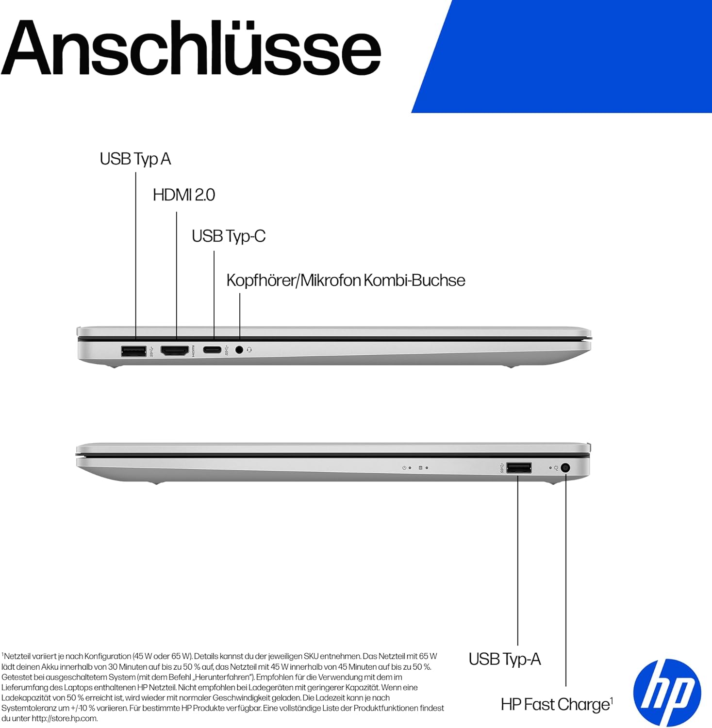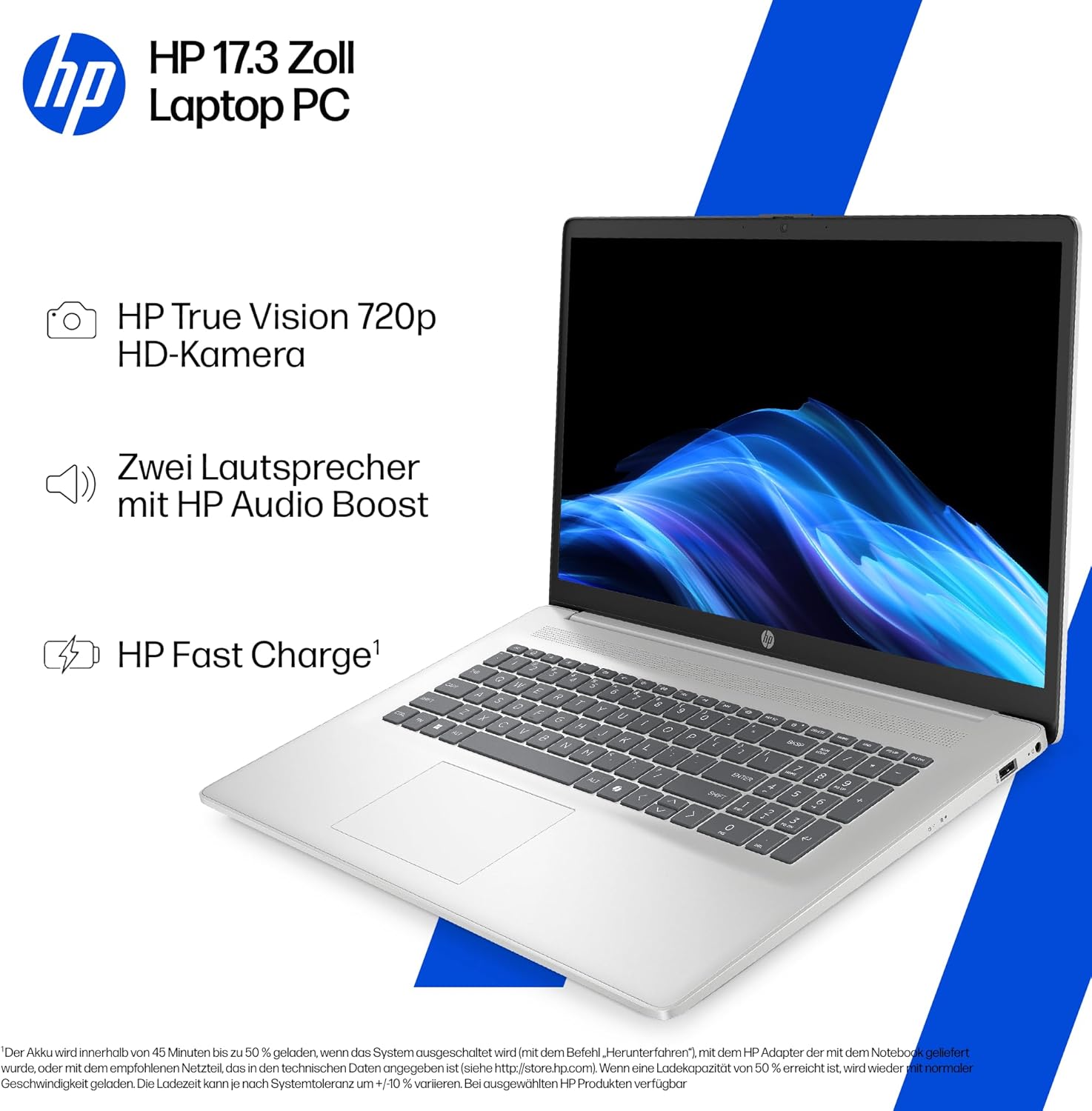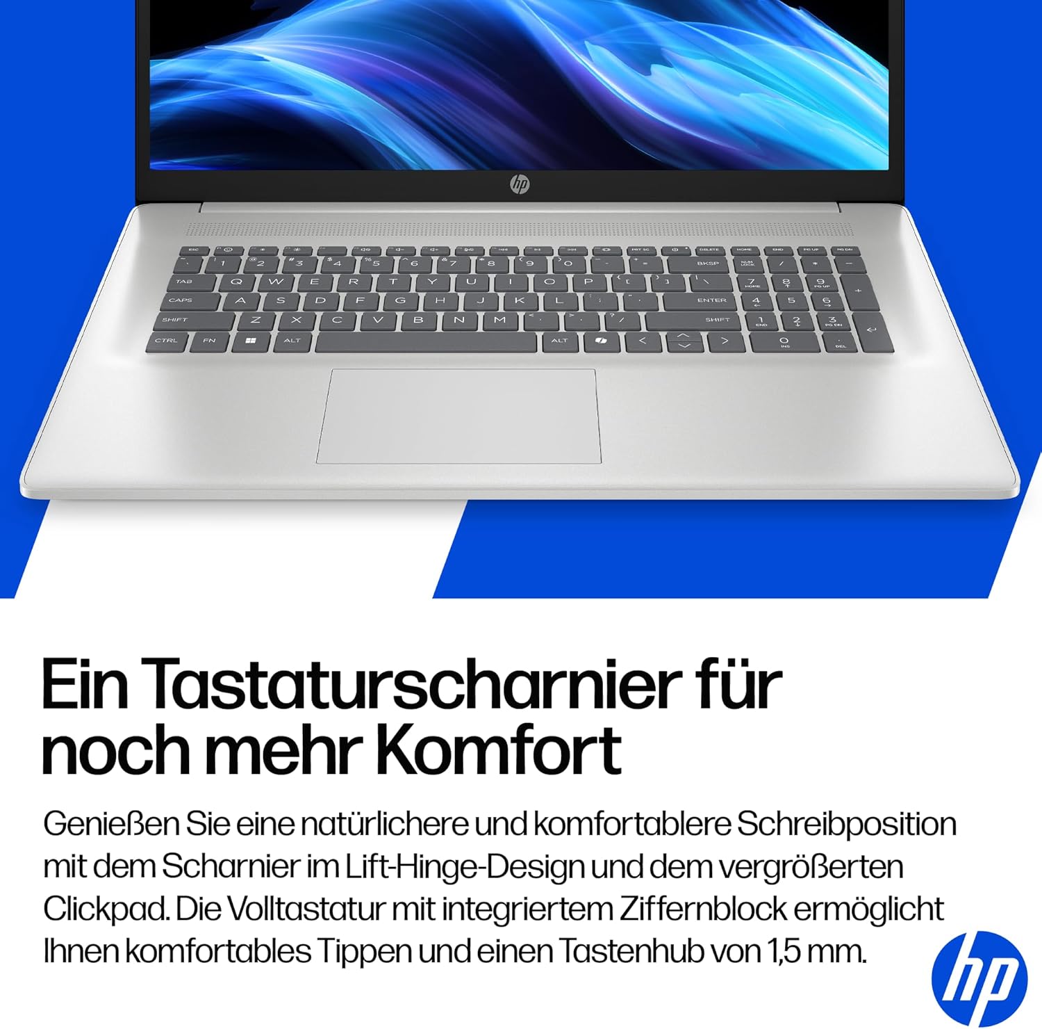Лаптоп HP със 17.3" FHD дисплей, Intel Core i5-1334U, 16GB DDR4 RAM, 512GB SSD, Intel Iris Graphics, Windows 11, QWERTZ клавиатура, сребрист с 25GB Dropbox памет за 12 месеца