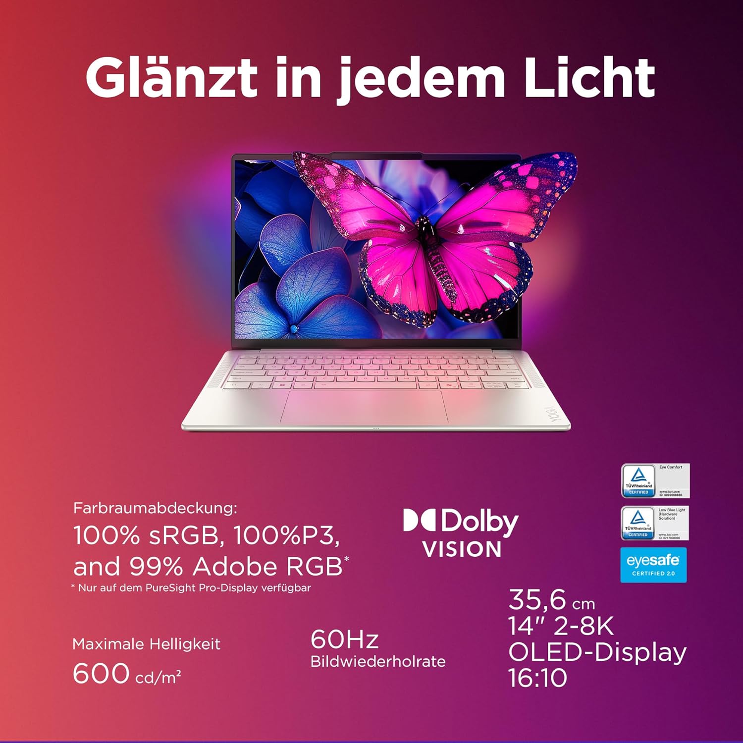 • Този 14-инчов тънък и лек OLED лаптоп със 100% покритие на цветовете P3 предлага ексклузивни Lenovo Smart Experiences, включително Smart Modes за оптимизирана производителност и Smart Share за безпроблемно свързване.