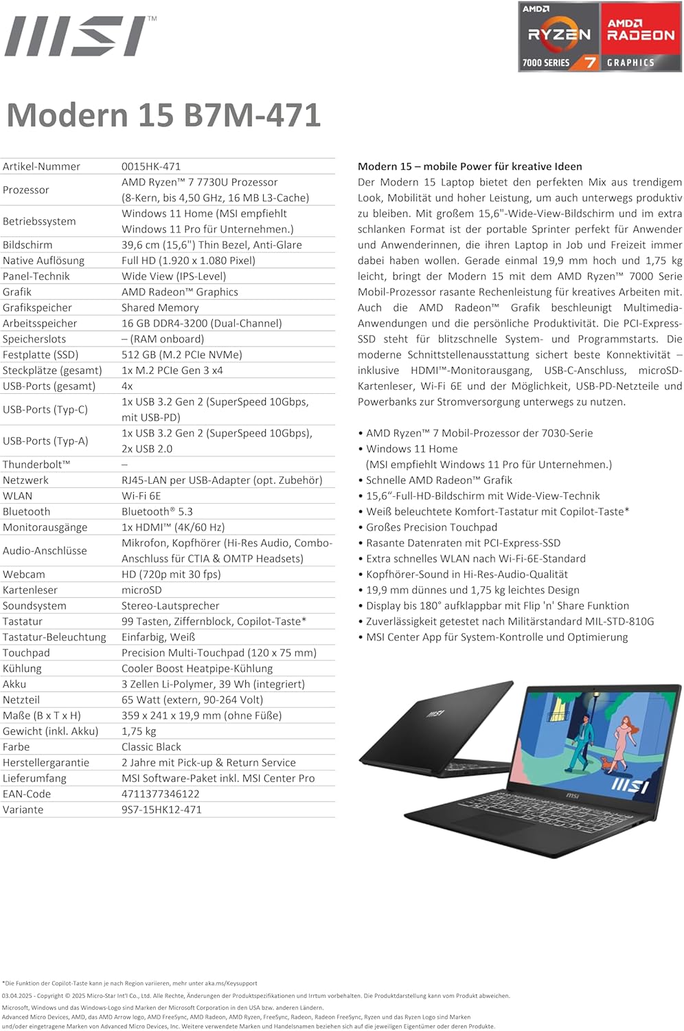Лаптопът Modern 15 предлага перфектната комбинация от стилен външен вид, мобилност и висока производителност, за да останете продуктивни в движение. С голям 15,6-инчов широкоъгълен екран и изключително тънък формат, този преносим спринтьор е идеален за потребители, които искат да носят лаптопа си със себе си за работа и забавление. С дебелина само 19,9 мм и тегло само 1,75 кг, Modern 15, захранван от мобилния процесор AMD Ryzen 7000 Series, осигурява светкавична изчислителна мощност за творческа работа.