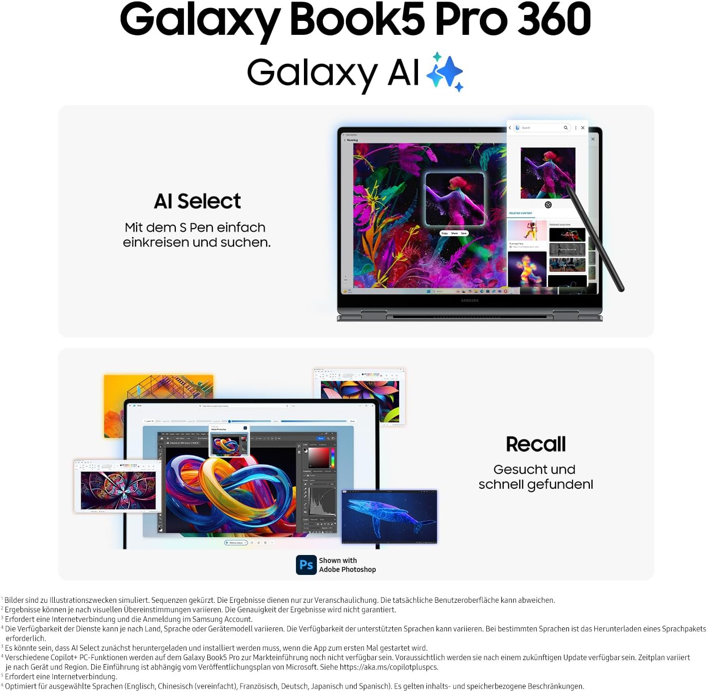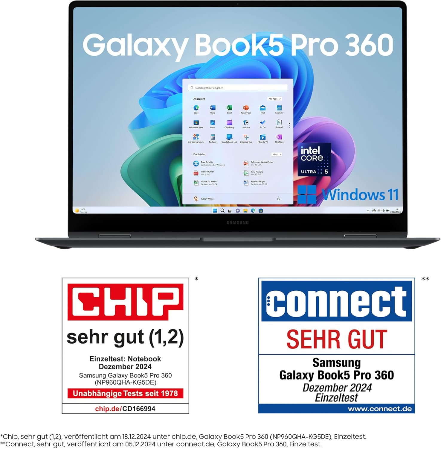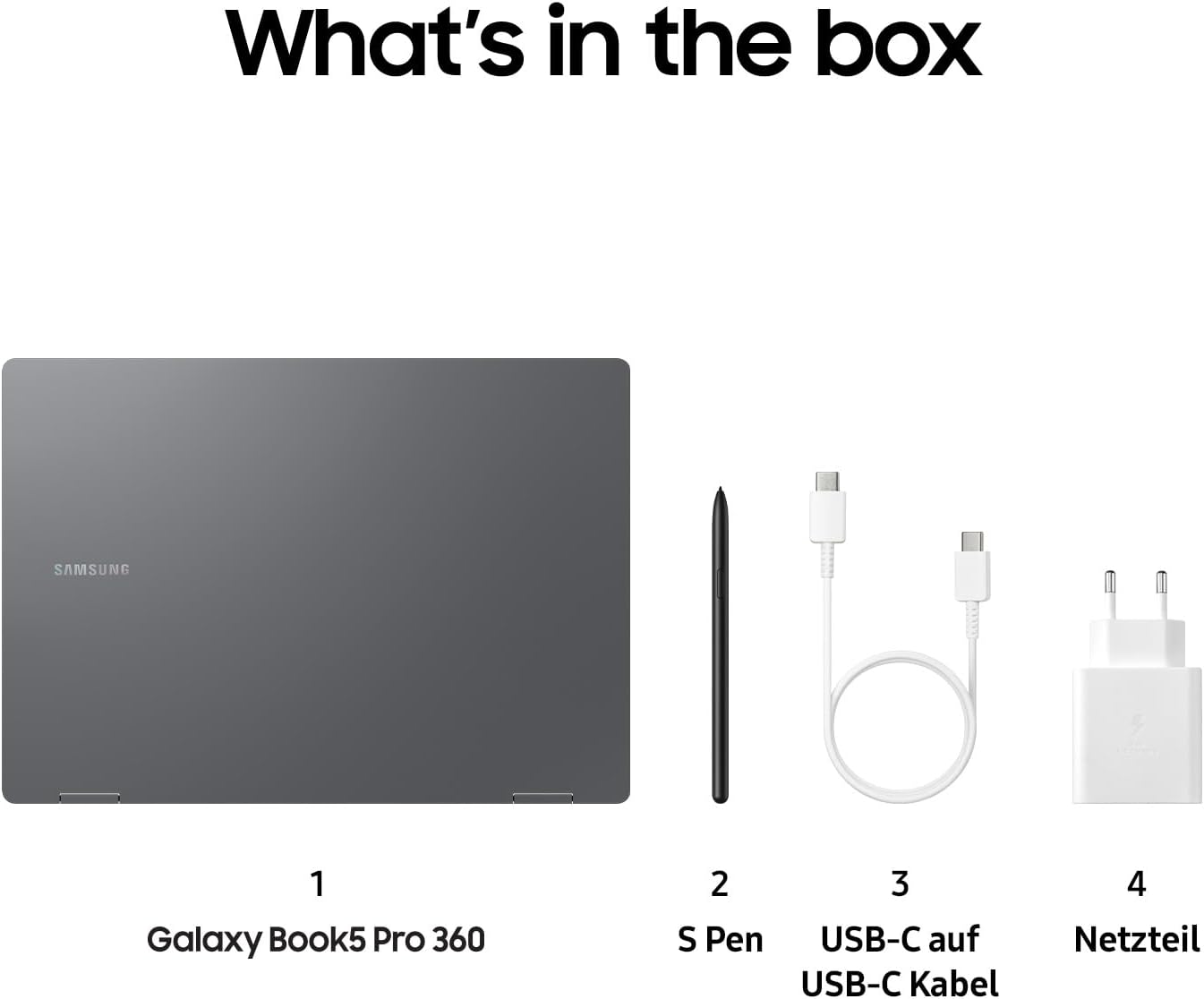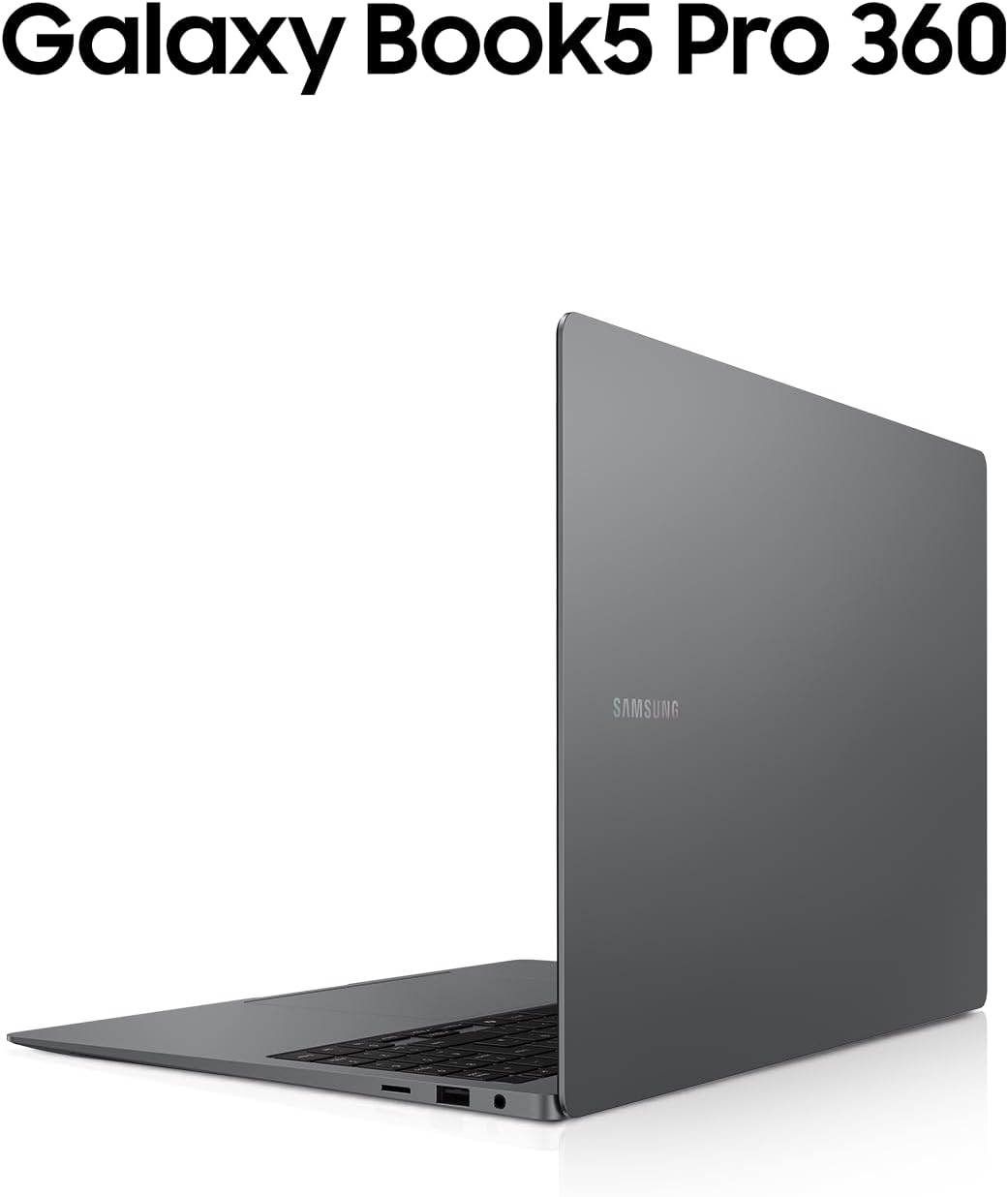 Лаптоп Samsung Galaxy Book5 Pro 360 2-в-1, 16-инчов дисплей, конвертируем ноутбук с изкуствен интелект, Intel Core Ultra 7, 16 GB RAM, 512 GB памет, Copilot+ PC, цвят Moonstone Gray, 3-годишна гаранция