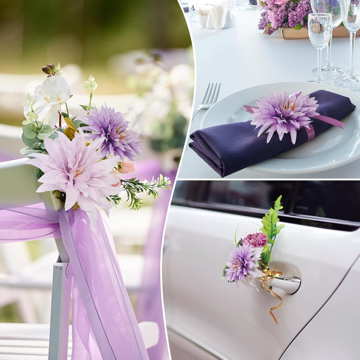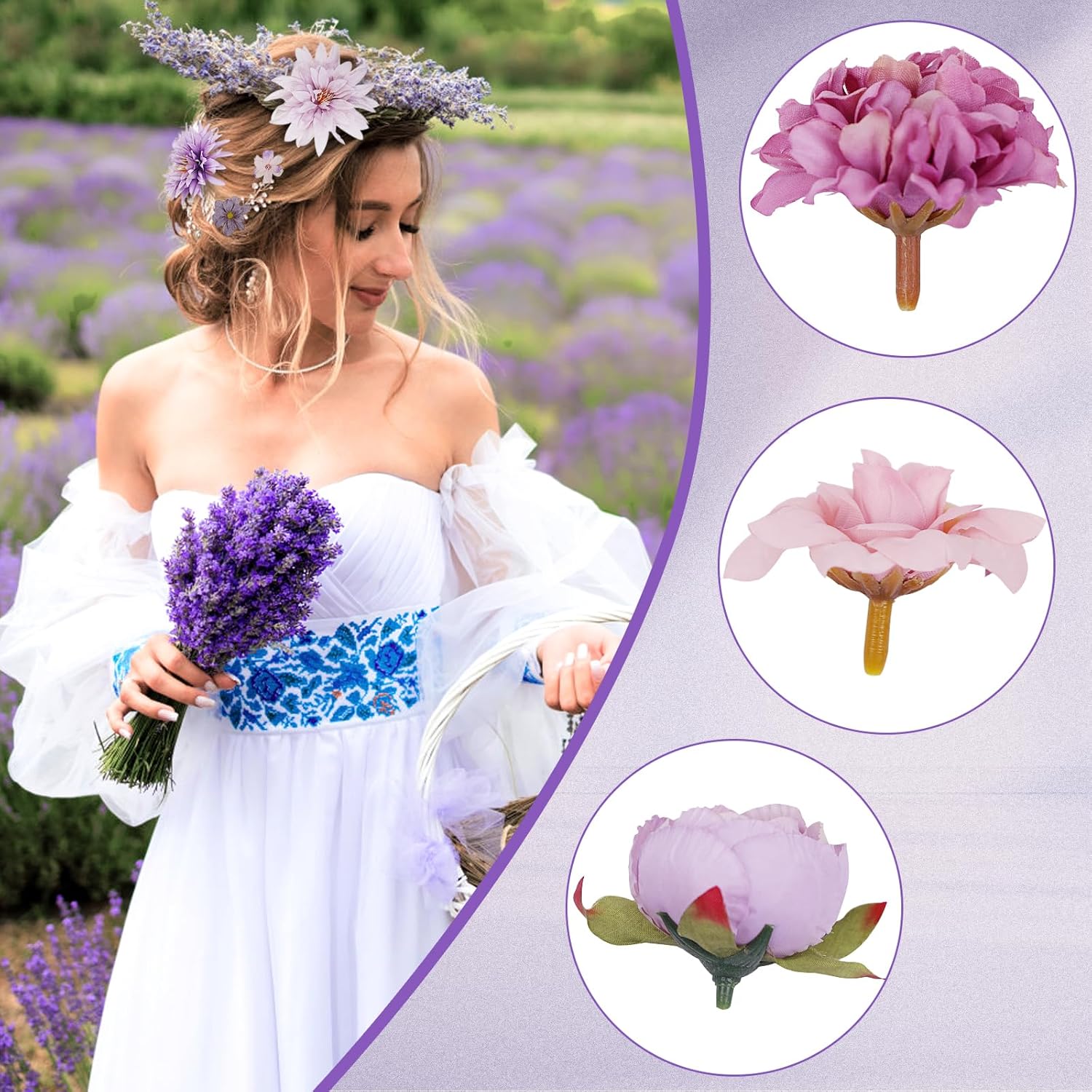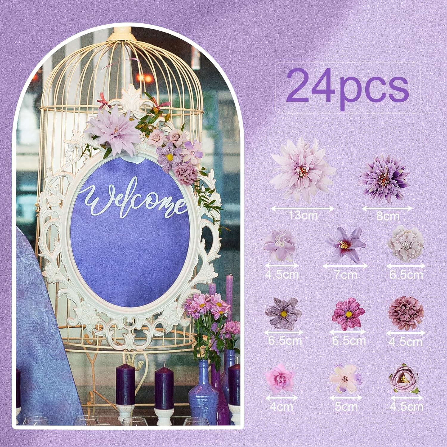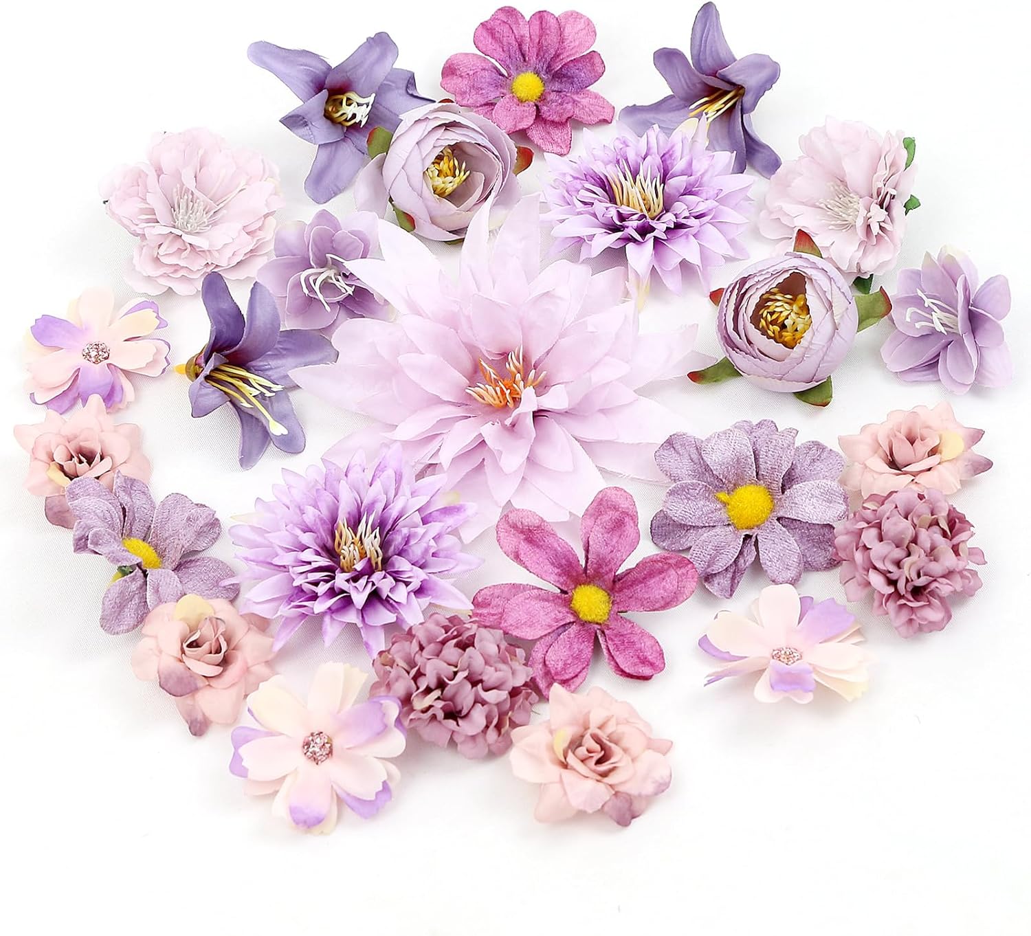 LARDUX 24 броя изкуствени цветя за занаяти, изкуствени цветни глави, изкуствени цветни глави, малки цветя, изкуствени цветни глави, големи копринени цветни глави за „Направи си сам“ занаяти, сватба, парти, домашен ръкоделие, декорация, лилави