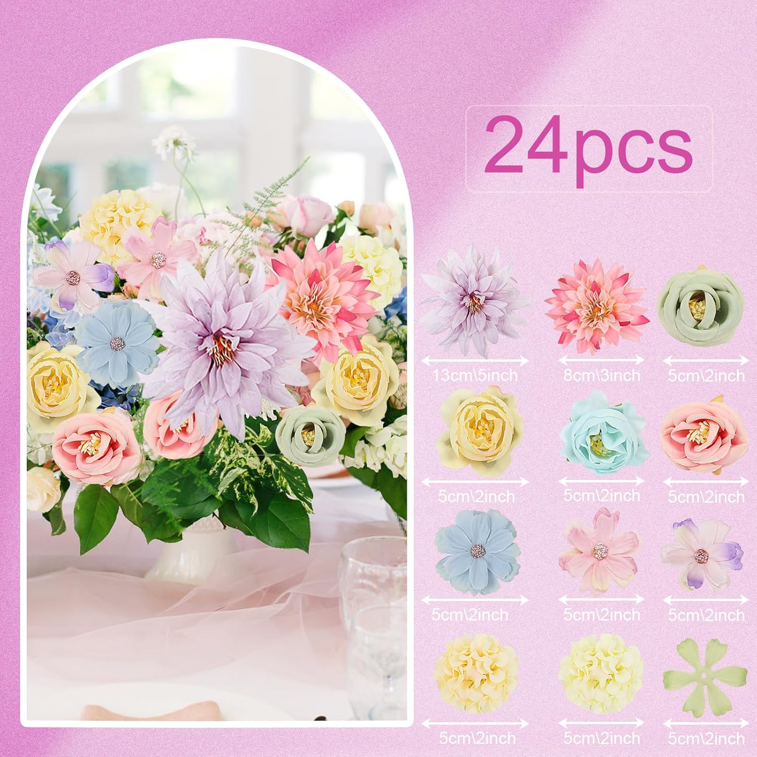 LARDUX Пакет от 24 изкуствени цветни глави, изкуствени цветни глави, малки цветя, изкуствени цветни глави, големи копринени цветни глави за „Направи си сам“ занаяти, скрапбукинг, сватба, парти, домашен ръкоделие, декорация