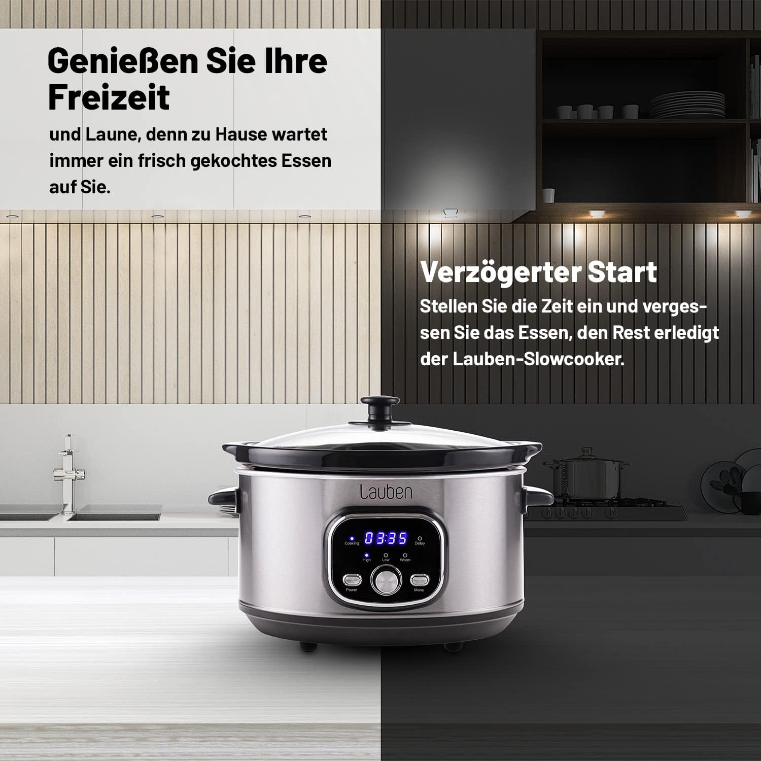 • Луксозни, сочни ястия – Lauben Slow Cooker 3500SB е бавен котлон, който ви спестява много време и с който можете да приготвите луксозни, сочни ястия дори с по-евтини съставки. Подходящ е за всички ястия, при които по-ниските температури и повече време са идеални, като супи, рагута или сосове, без вашата намеса. Размерът е идеален за голяма семейна вечеря или събиране с приятели, но благодарение на компактната си форма не заема твърде много място.