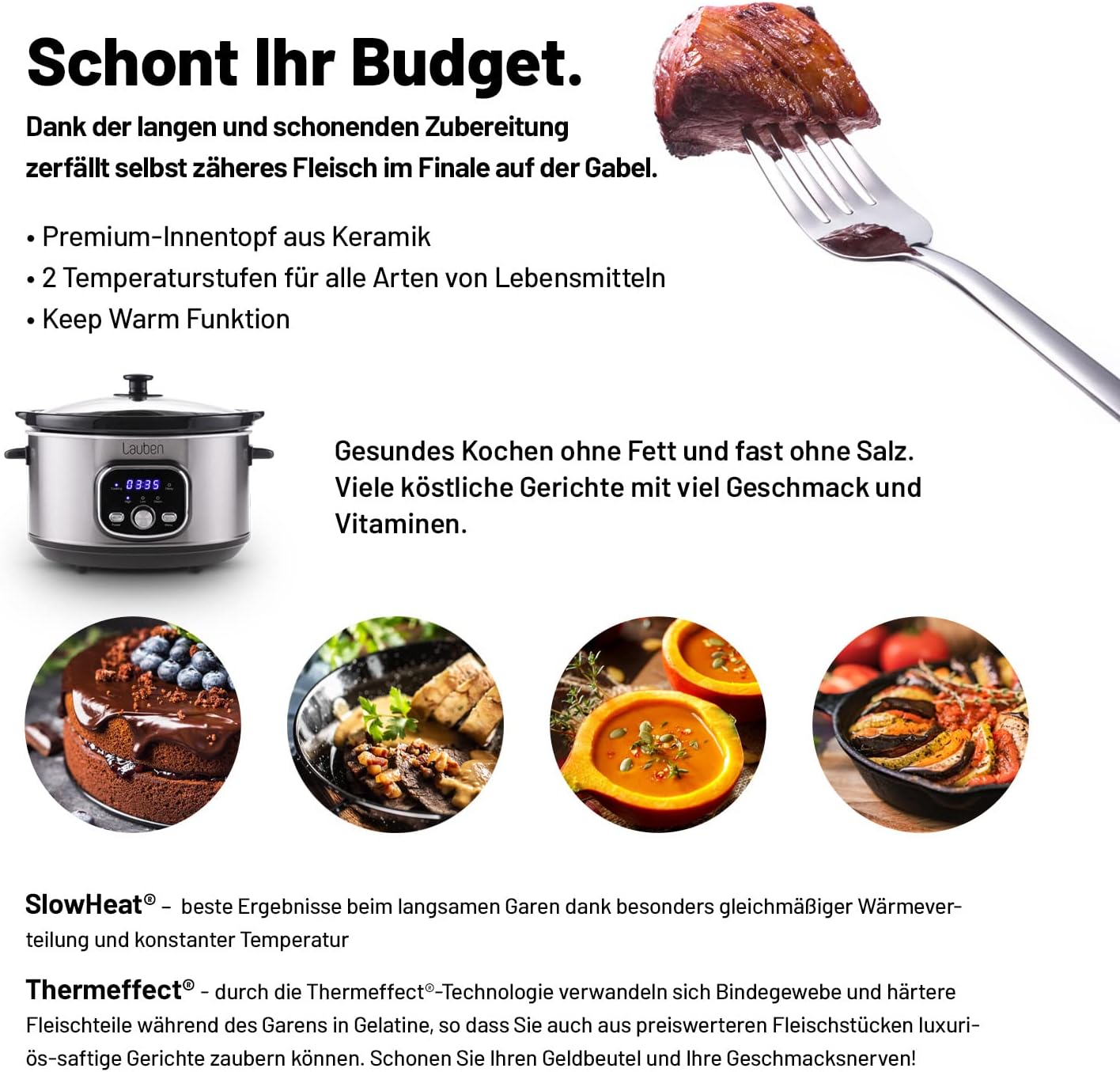 Lauben Slow Cooker 3500SB Бавна готварска печка с технология Thermeffect®, технология SlowHeat®, готварска книга, керамичен вътрешен съд, две температурни настройки, ръчно настройване на времето, 3,5 л