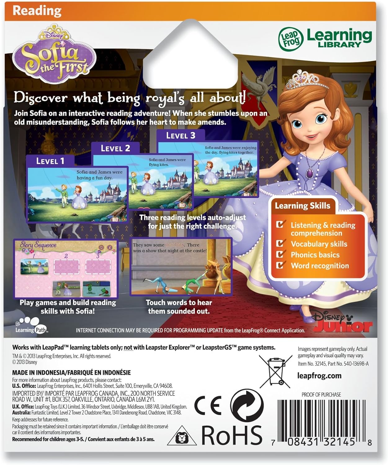 HauptmerkmaleLesen oder hören Sie zusammen mit Sofia der ersten und beliebtesten Charaktere in dieser großartigen Geschichte mit wahrem Herzen. Mit drei Textebenen, sechs integrierten Lernspielen und pädagogisch gestalteten Lesestütze, können aufstrebende Leser königliche Schritte in ihren Lesefähigkeiten machen, während sie dieses interaktive Geschichtenbuch erkunden. Drei Minispiele und ein besonderer Blick auf das Schlossleben tragen zum Spaß und Lernen bei! Kinder verdienen Abzeichen für Lernerfolge, die spezielle Gegenstände freischalten. Eltern können sich mit dem Online-LeapFrog Learning Path verbinden, um individuelle Lerneinblicke und Ideen zur Erweiterung des Lernens zu erhalten.