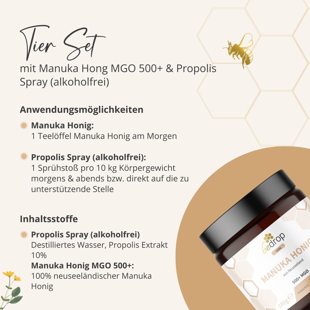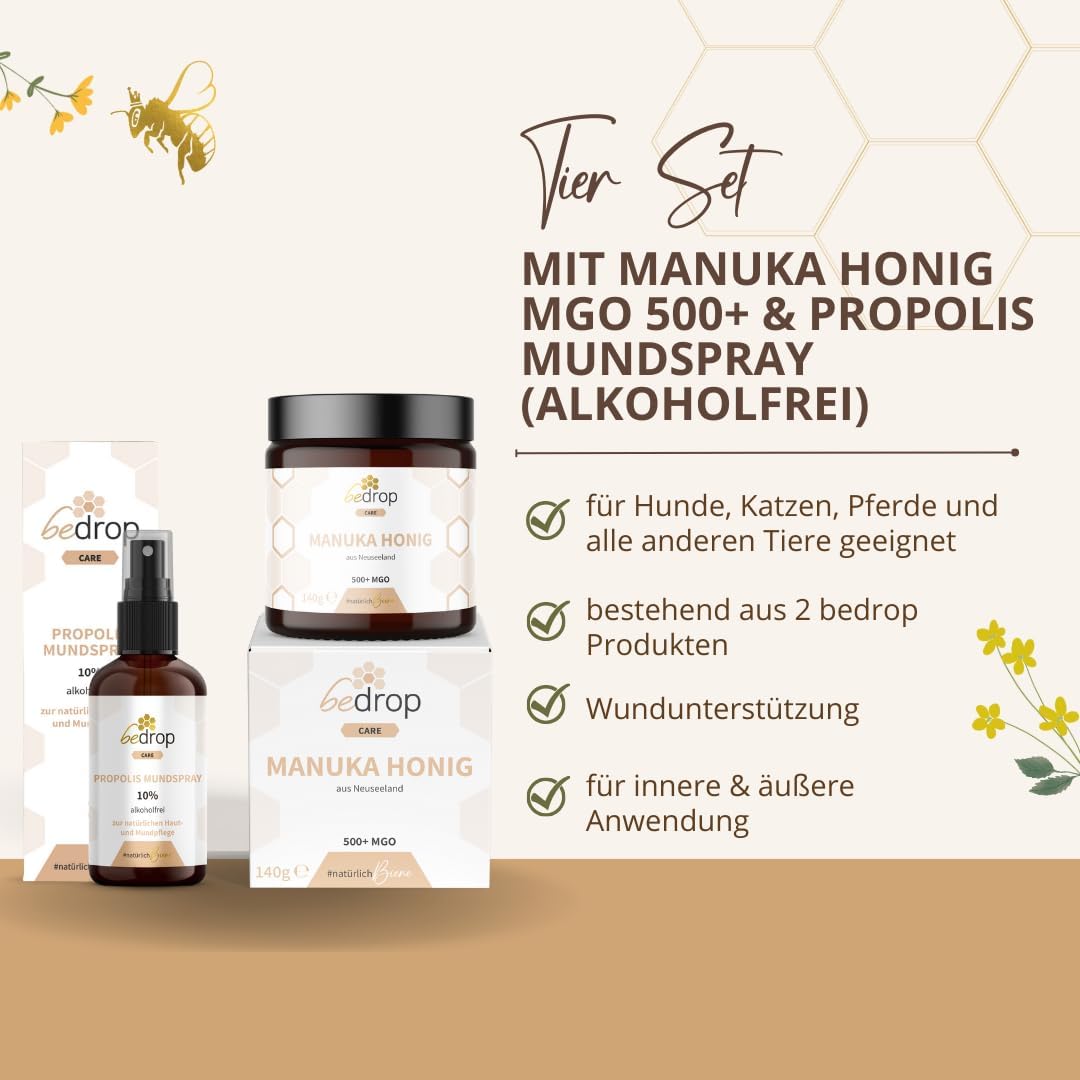 легло | Комплект за животни - Прополисов спрей (без алкохол) и мед от манука MGO 500+ за кучета, котки, коне и всички други животни
