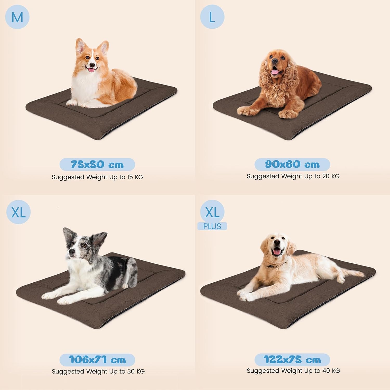 • Легло за кучета със среден размер: Размерите на тази възглавница за кучета със среден размер са 90 x 60 см и е идеална за средни кучета като кокер шпаньол, спрингер шпаньол и ръсел териер до 23 кг. Моля, измерете тялото на вашия домашен любимец, за да намерите подходящия размер.