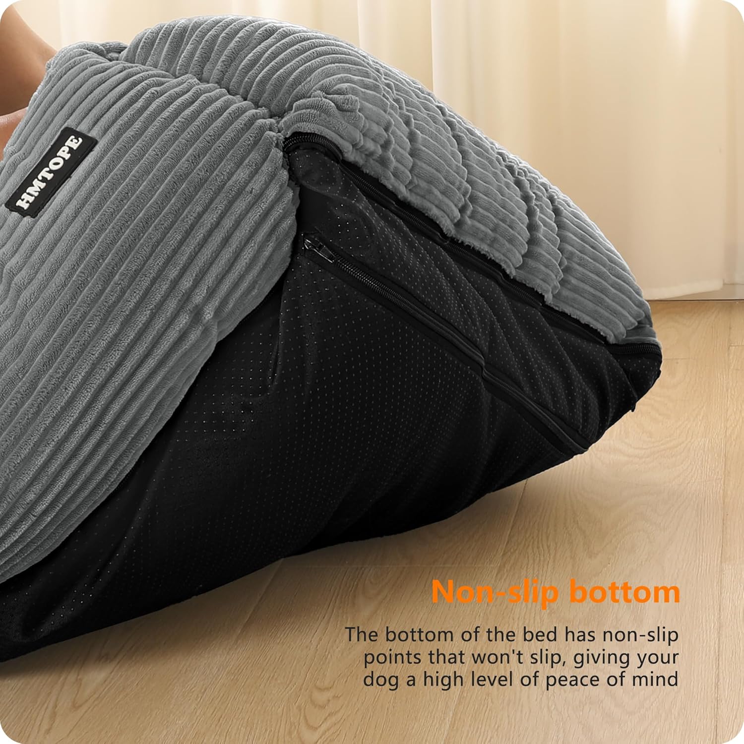 • Неплъзгаща се основа: Долната страна на леглото за кучета е снабдена с висококачествени, неплъзгащи се издатини. Те осигуряват здраво сцепление върху гладки подове и ефективно предотвратяват подхлъзване или преобръщане на леглото, когато кучето ви почива или играе. Така то предлага на вашия домашен любимец стабилна и безопасна среда за спане по всяко време.