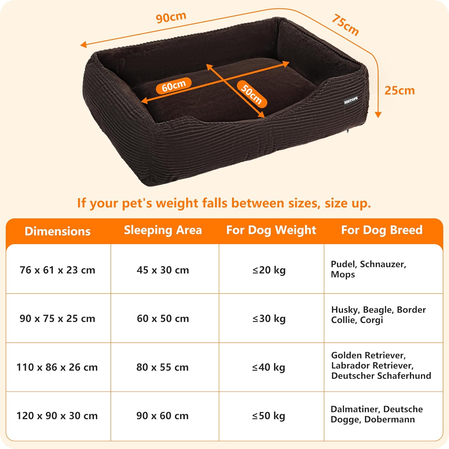 • Разнообразие от размери, от които да избирате: Това легло за кучета се предлага в разумни размери от 76 см, 90 см, 110 см и 120 см, за да отговори на нуждите на кучета с всякаква височина. Важна забележка при първоначална употреба на леглото: След разопаковане, моля, разтърсете леко леглото и го оставете за 24 часа. След това пълнежът се разгъва напълно и постига оптимално, пухкаво и поддържащо комфортно състояние.