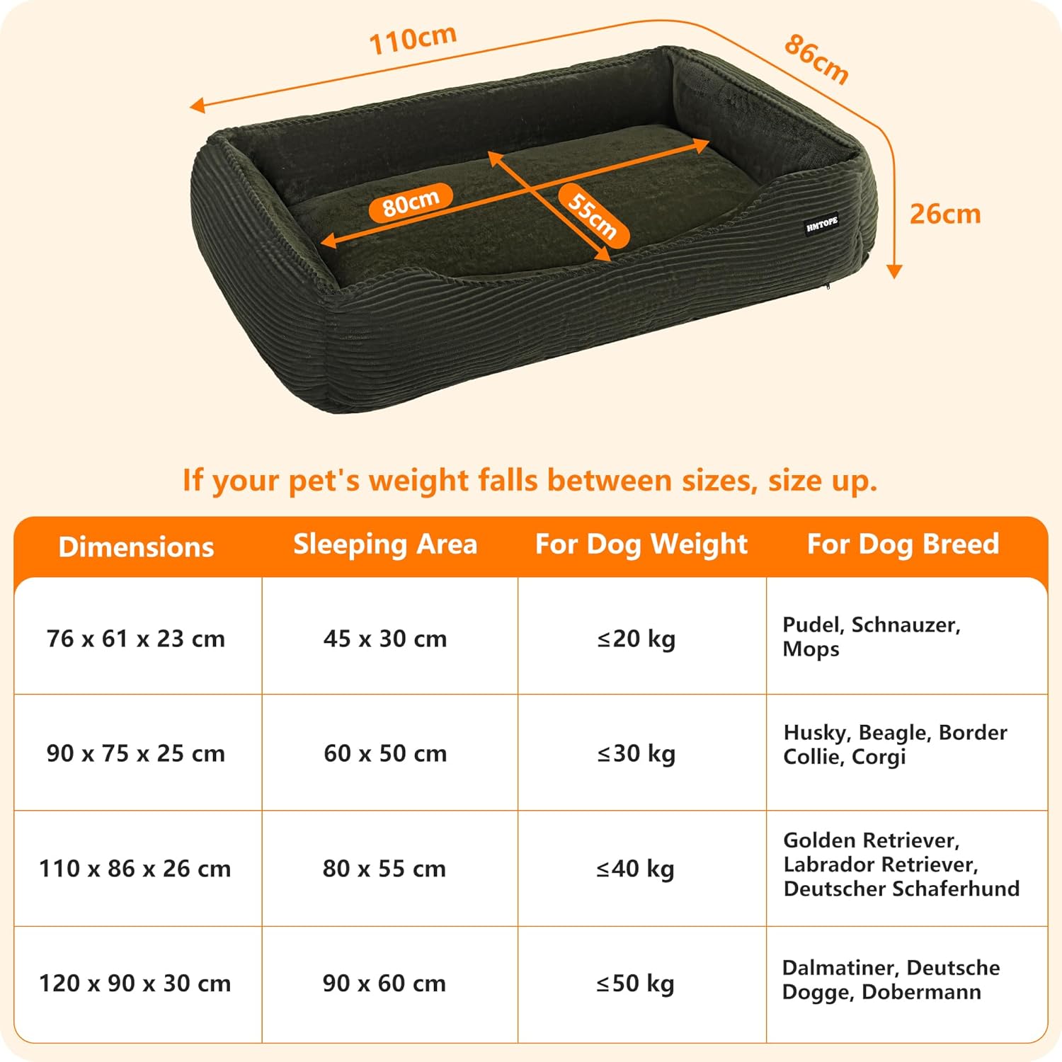 • Разнообразие от размери, от които да избирате: Това легло за кучета се предлага в разумни размери от 76 см, 90 см, 110 см и 120 см, за да отговори на нуждите на кучета с всякаква височина. Важна забележка при първоначална употреба на леглото: След разопаковане, моля, разтърсете леко леглото и го оставете за 24 часа. След това пълнежът се разгъва напълно и постига оптимално, пухкаво и поддържащо комфортно състояние.