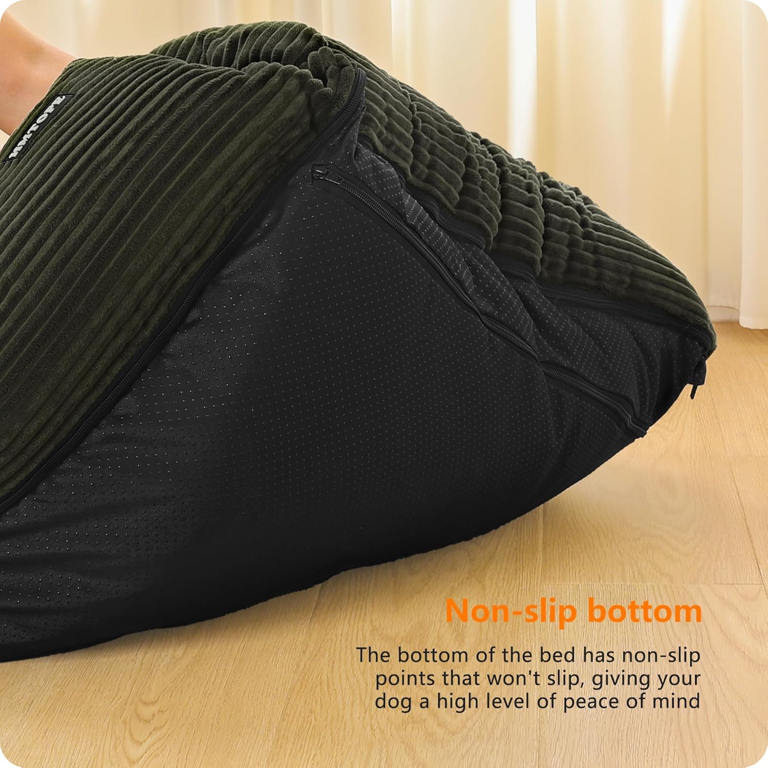 • Неплъзгаща се основа: Долната страна на леглото за кучета е снабдена с висококачествени, неплъзгащи се издатини. Те осигуряват здраво сцепление върху гладки подове и ефективно предотвратяват подхлъзване или преобръщане на леглото, когато кучето ви почива или играе. Така то предлага на вашия домашен любимец стабилна и безопасна среда за спане по всяко време.