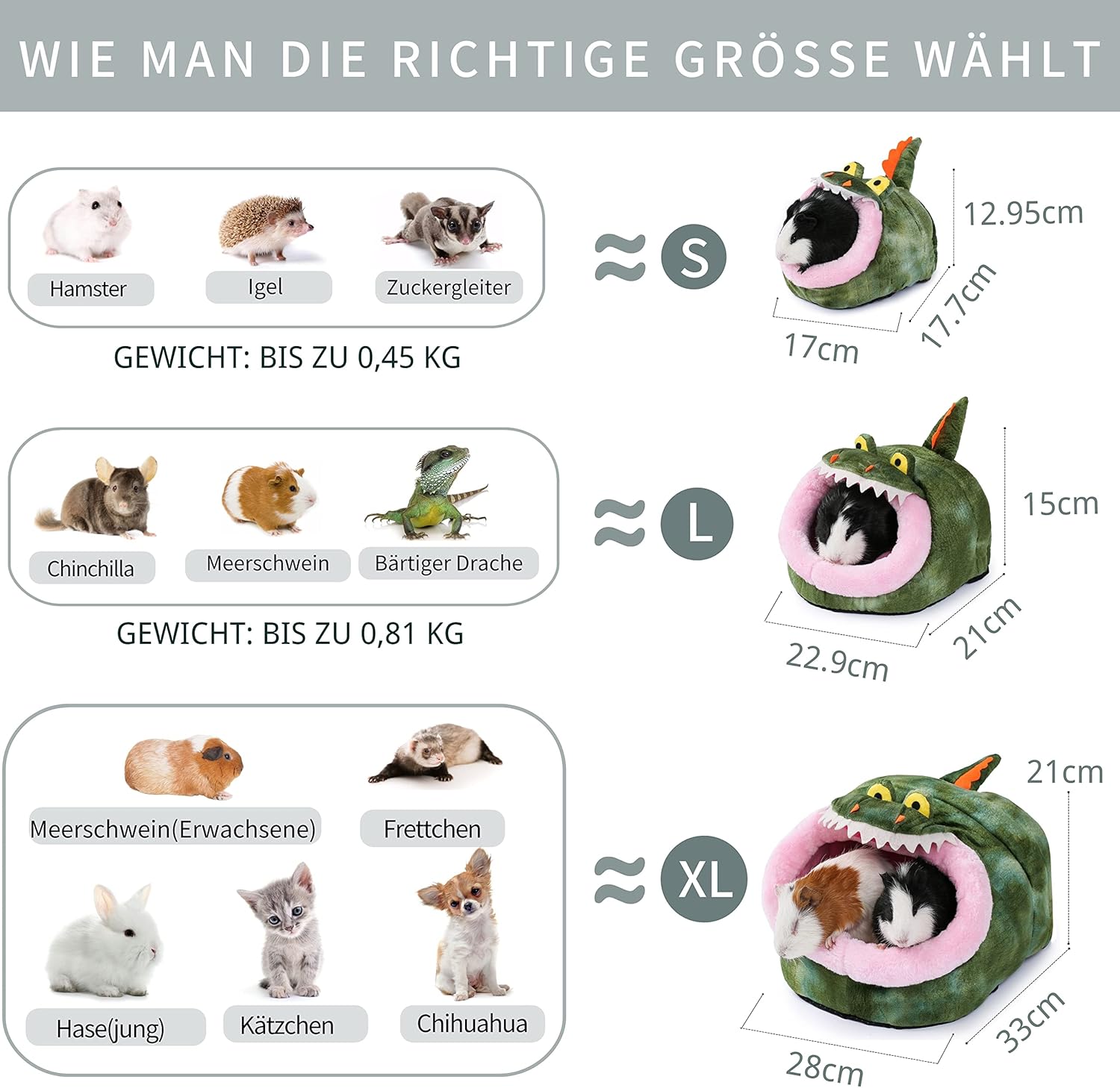 3 варианта за размер: Малък е подходящ за бебе морско свинче (тегло не повече от 0,45 кг); Голям е подходящ за малко морско свинче (тегло не повече от 0,82 кг); Много голям е подходящ за по-голямо животно или две възрастни морски свинчета, които да споделят пространството (общото тегло не надвишава 1,72 кг). Препоръчваме