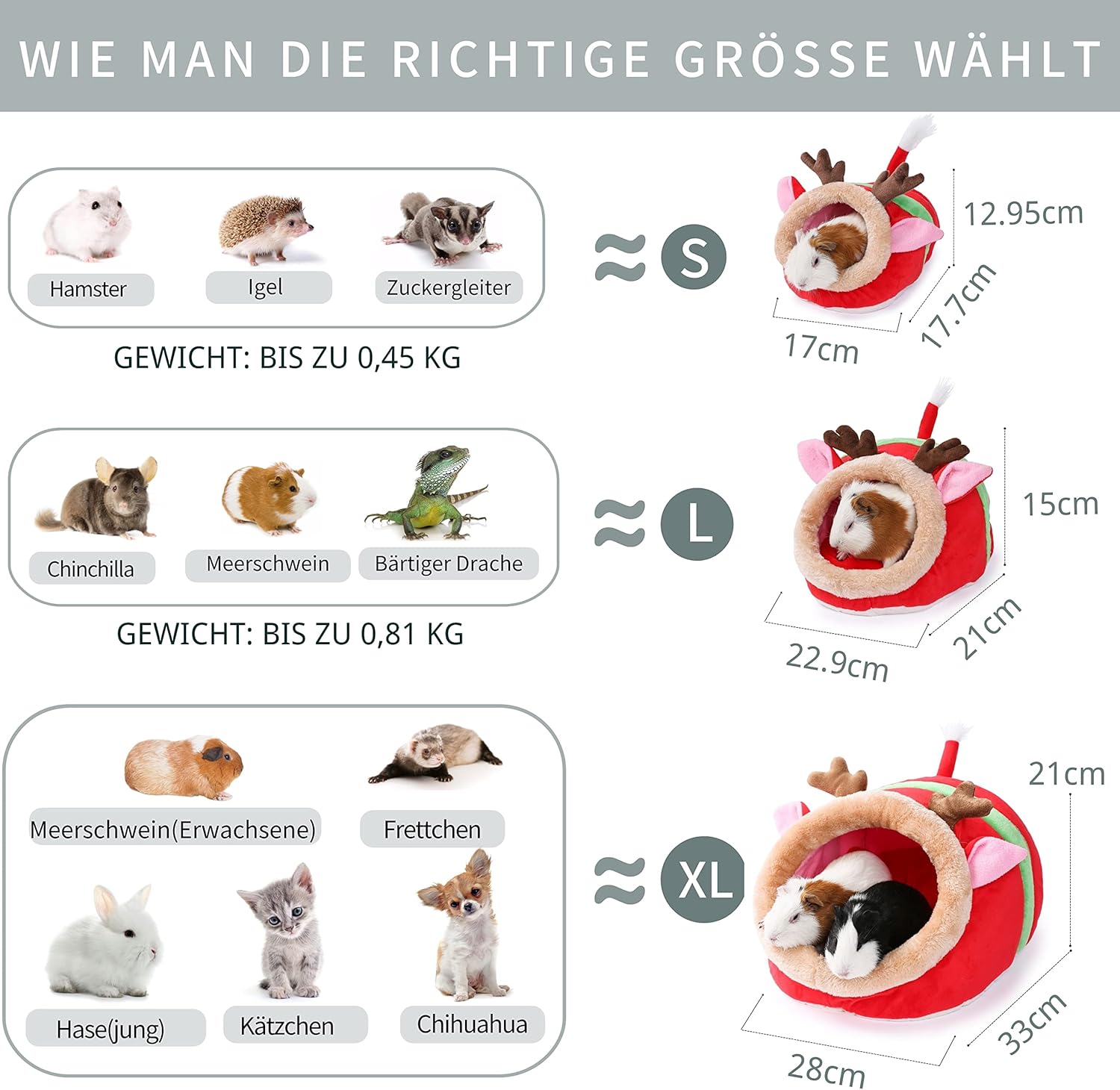 3 варианта за размер: Малък е подходящ за бебе морско свинче (тегло не повече от 0,45 кг); Голям е подходящ за малко морско свинче (тегло не повече от 0,82 кг); Много голям е подходящ за по-голямо животно или две възрастни морски свинчета, които да споделят пространството (общото тегло не надвишава 1,72 кг). Препоръчваме