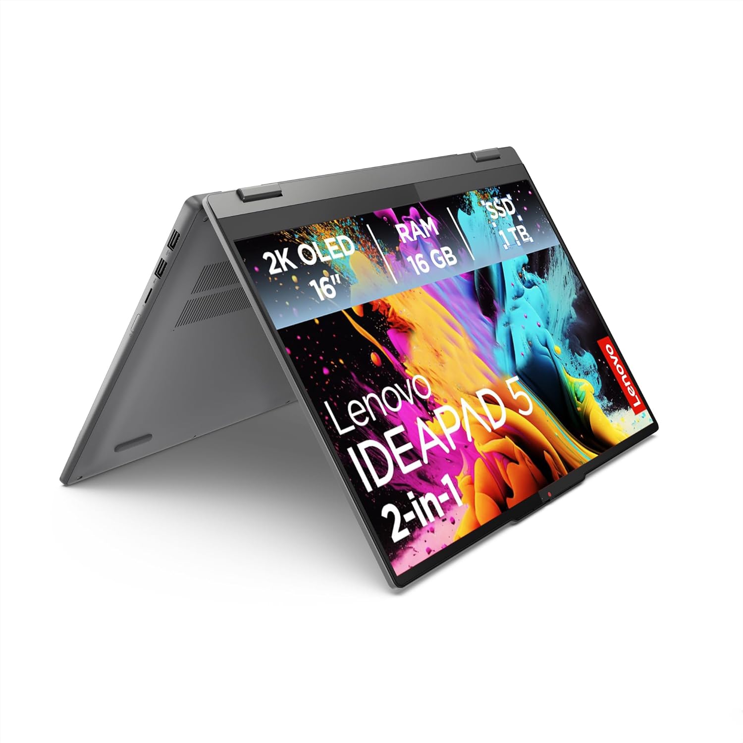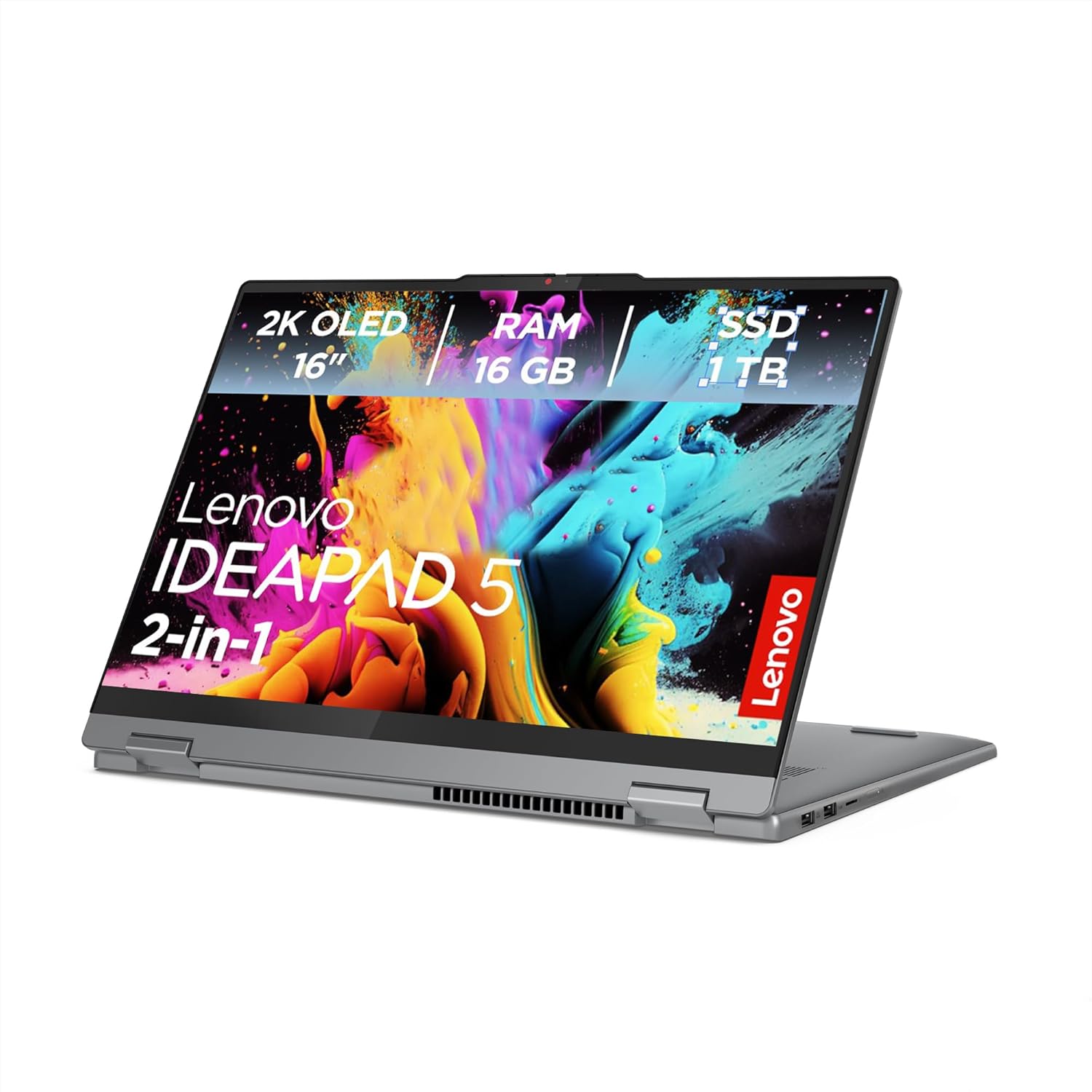 Lenovo IdeaPad 5 2-в-1 AI лаптоп, 16-инчов 2K сензорен OLED дисплей, AMD Ryzen 7 8845HS, 16GB RAM, 1TB SSD, AMD Radeon Graphics, Windows 11 Home, QWERTZ клавиатура, сив, 3 месеца Premium Care