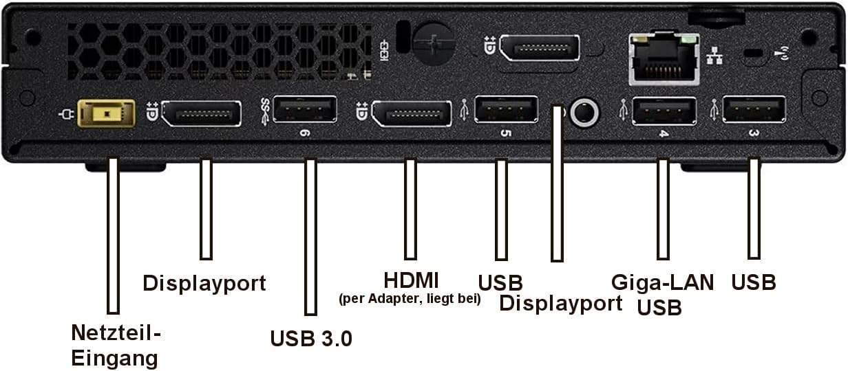 Връзки: 1x HDMI (чрез включения адаптер), 2x Displayport, 3x USB 3.0, 2x USB 2.0, Gigabit LAN, WLAN, 2x аудио.