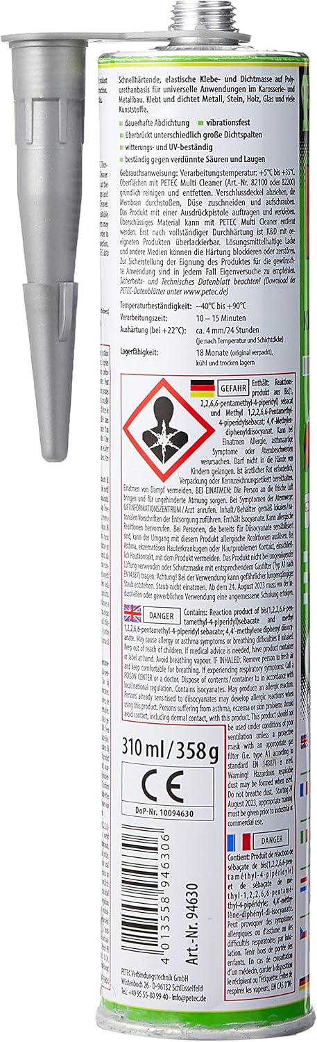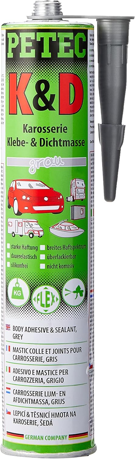 K & D черно 310 мл бързовтвърдяващо, еластично еднокомпонентно лепило и уплътнител на базата на полиуретан, което се втвърдява от влажността и след това може да се боядисва. Широк спектър на адхезия. Силна адхезия. Премоства уплътнителни фуги с различни размери. Дълготраен уплътнителен ефект. Трайно еластичен и устойчив на вибрации. Може да се боядисва. Без силикон. Некорозивен. Устойчив на атмосферни влияния и UV лъчи. Устойчив на разредени киселини и основи. Области на приложение: универсално приложение в каросерии и контейнери. Конструкция: залепен метал (листова стомана, сурова, грундирана и боядисана, алуминий, неръждаема стомана) и много пластмаси, както и дърво и стъкло, например при уплътняване на метални конструкции, силно натоварени съединения, залепване на вибриращи части. Практически съвет: температурата ускорява процеса на втвърдяване; може да се боядисва само след пълно втвърдяване.