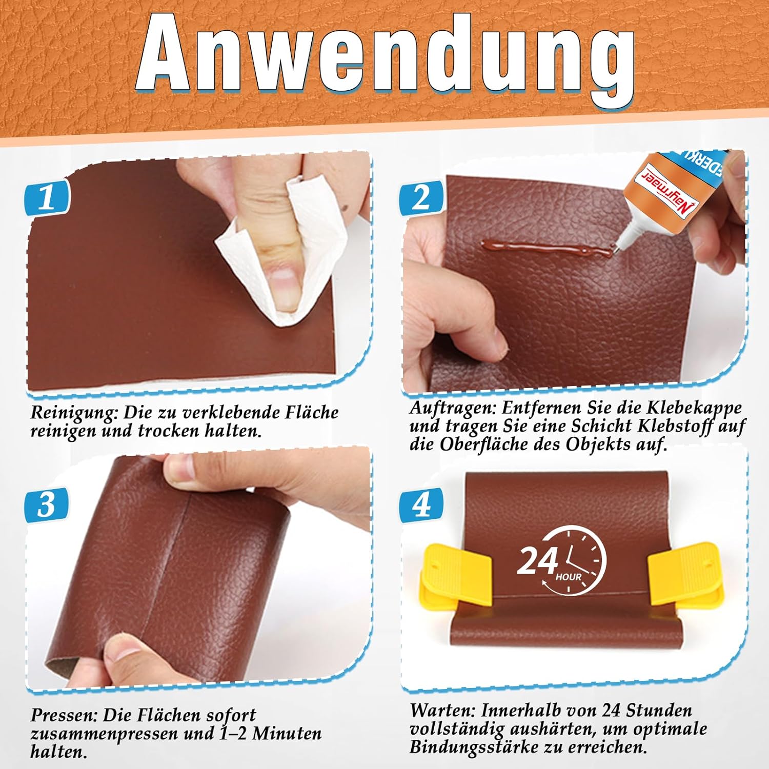 • Лесна употреба: почистете повърхността на кожата, която ще се ремонтира, преди нанасяне. След това нанесете лепилото равномерно и приложите подходящ натиск, за да осигурите здраво залепване. Изключително силното лепило за кожа изсъхва само за 6-10 минути и достига оптимална адхезия след 24 часа. Нанасянето е лесно и удобно, което позволява бързо извършване на ремонти.