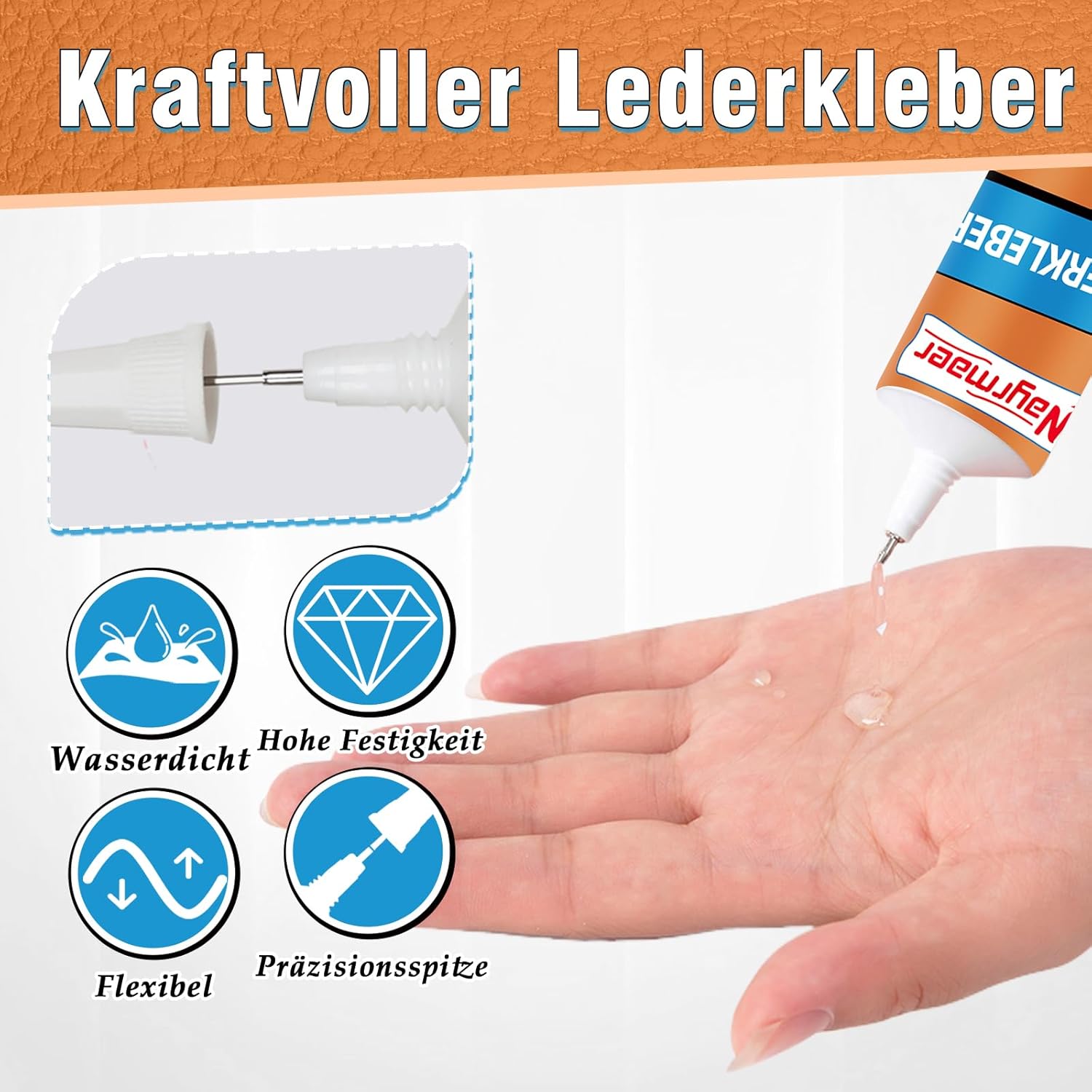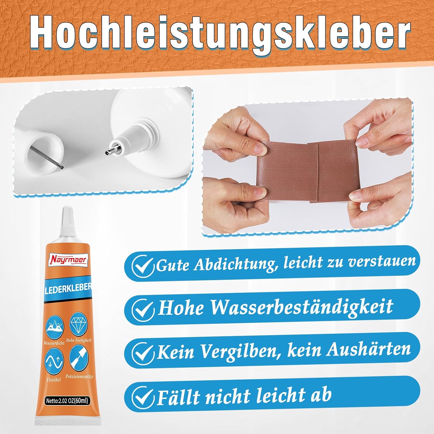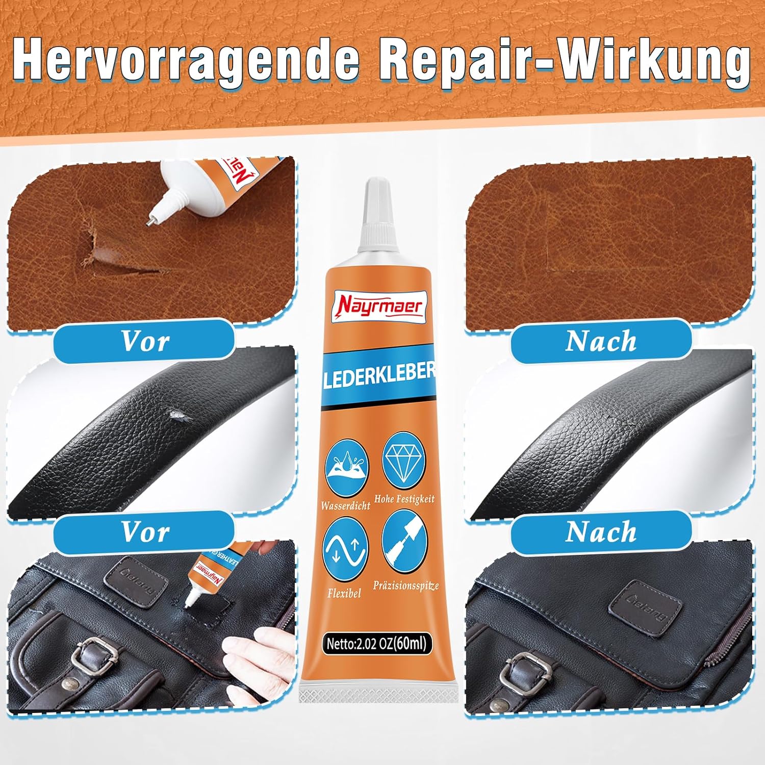 • СУПЕР СИЛНО СВЪРЗВАНЕ Лепилото за кожа Nayrmaer използва особено силна свързваща формула, за да осигури отлична адхезия към различни порести и непорести материали. Независимо дали е кожа, винил или плат, лепилото образува трайна и гъвкава връзка, която гарантира, че ремонтираният артикул остава издръжлив и не се чупи лесно. Лепилото за кожа изсъхва прозрачно и не пожълтява и не се втвърдява, така че безпроблемните ремонти могат да се извършват без никакви проблеми.