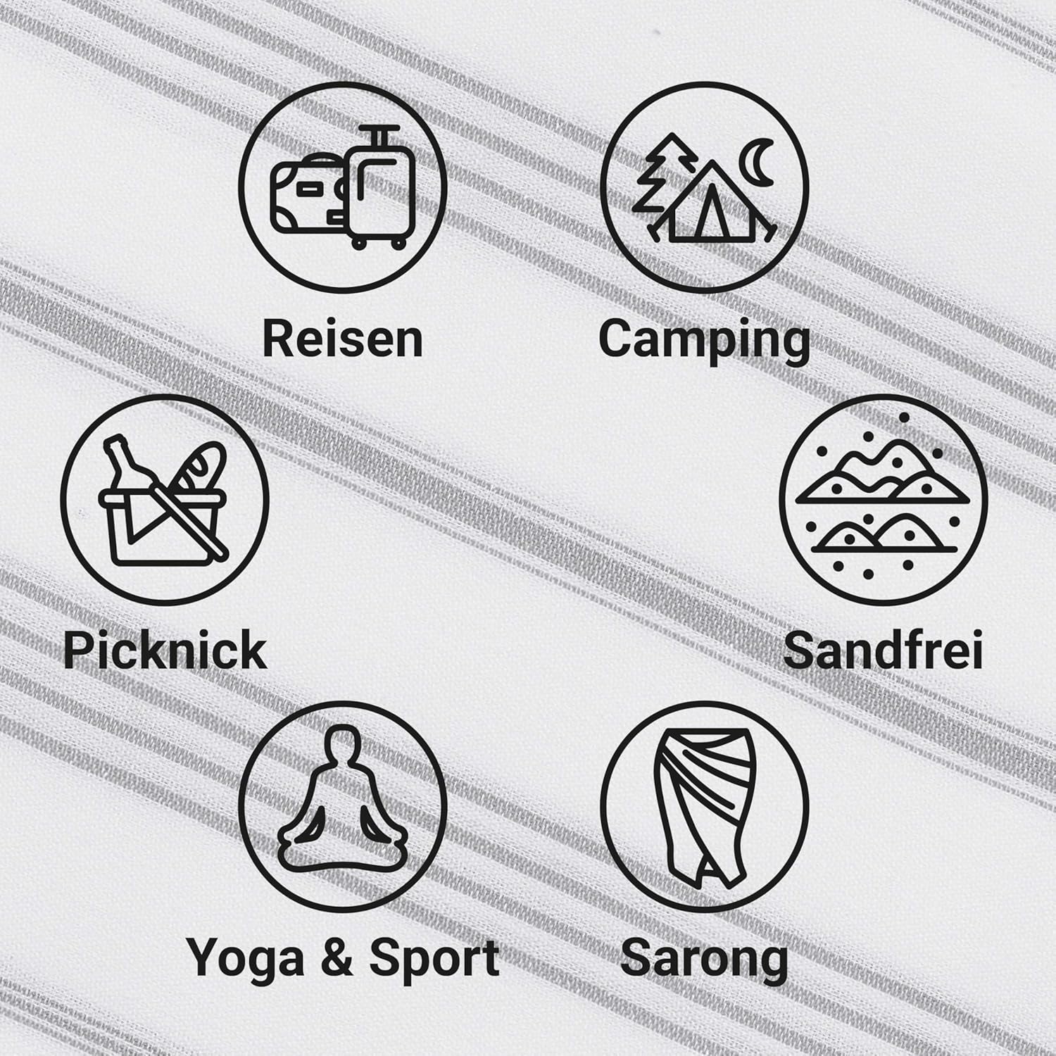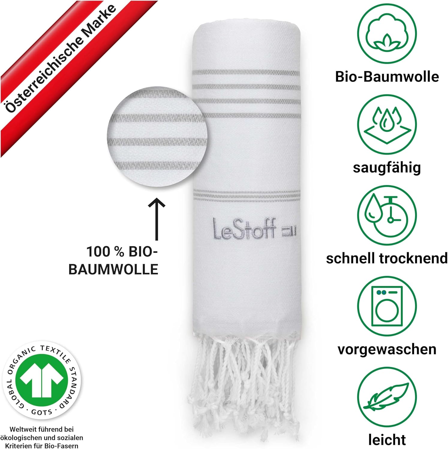 • Многофункционална: независимо дали за сушене, като плажна кърпа, кърпа за сауна, спортна кърпа, кърпа за баня или кърпа за йога – нашата хамам кърпа LeStoff впечатлява със своята многофункционалност. Идеална за пътуване, защото благодарение на лекотата си и възможността за навиване, тя е перфектната кърпа за пътуване и къмпинг.