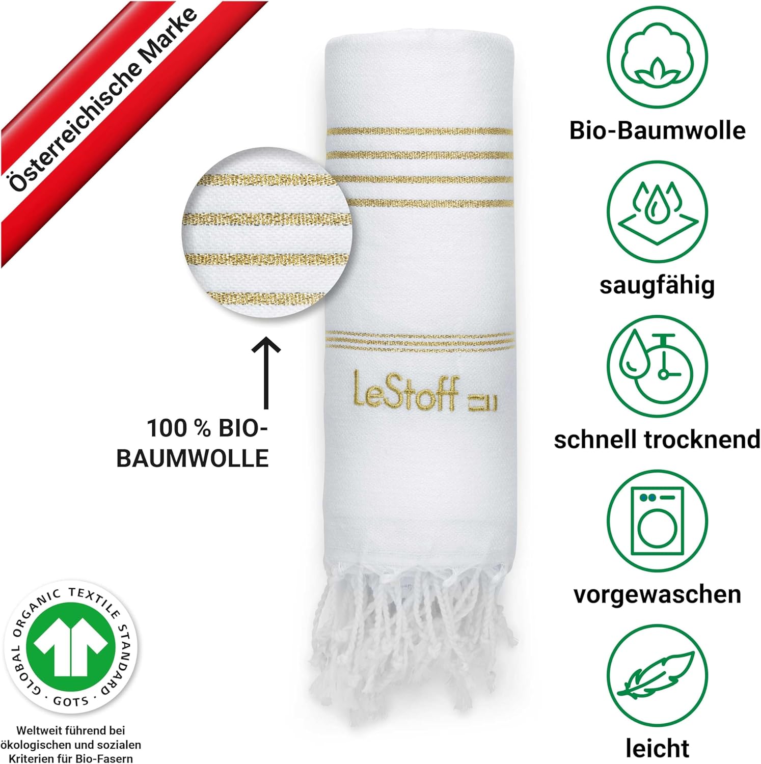 • Многофункционална: независимо дали за сушене, като плажна кърпа, кърпа за сауна, спортна кърпа, кърпа за баня или кърпа за йога – нашата хамам кърпа LeStoff впечатлява със своята многофункционалност. Идеална за пътуване, защото благодарение на лекотата си и възможността за навиване, тя е перфектната кърпа за пътуване и къмпинг.