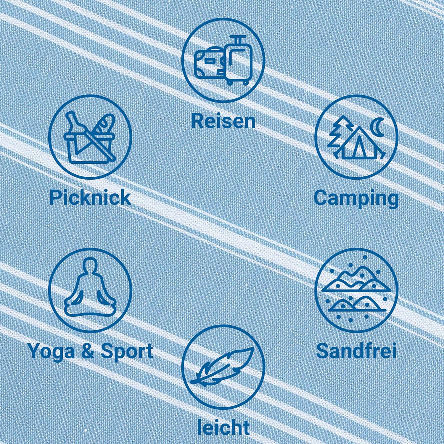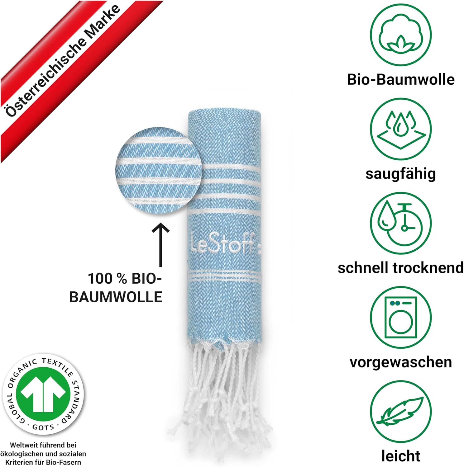 • Многофункционална: независимо дали за сушене, като плажна кърпа, кърпа за сауна, спортна кърпа, кърпа за баня или кърпа за йога – нашата хамам кърпа LeStoff впечатлява със своята многофункционалност. Идеална за пътуване, защото благодарение на лекотата си и възможността за навиване, тя е перфектната кърпа за пътуване и къмпинг.