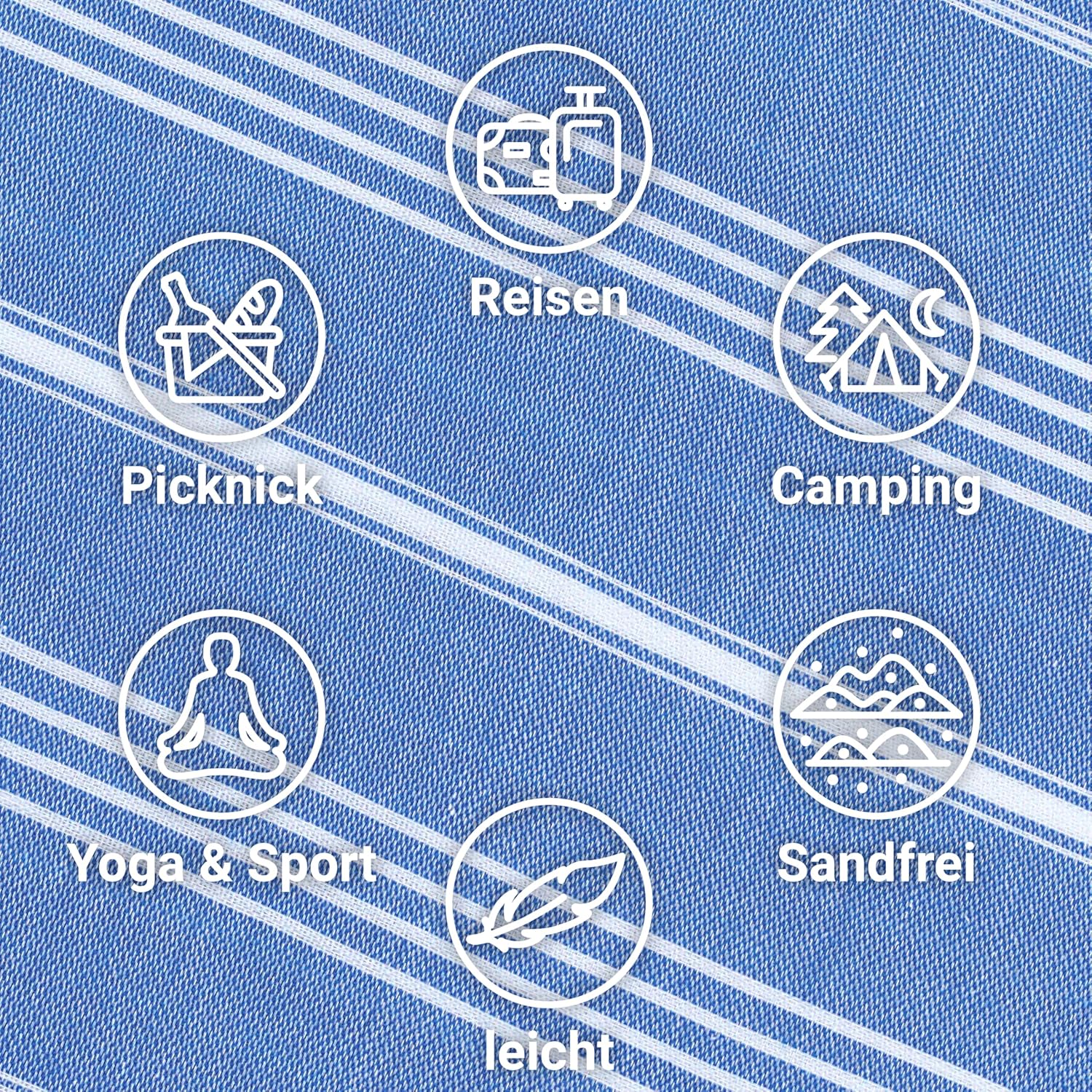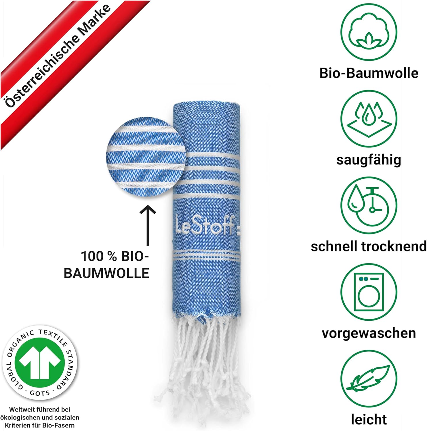 • Многофункционална: независимо дали за сушене, като плажна кърпа, кърпа за сауна, спортна кърпа, кърпа за баня или кърпа за йога – нашата хамам кърпа LeStoff впечатлява със своята многофункционалност. Идеална за пътуване, защото благодарение на лекотата си и възможността за навиване, тя е перфектната кърпа за пътуване и къмпинг.