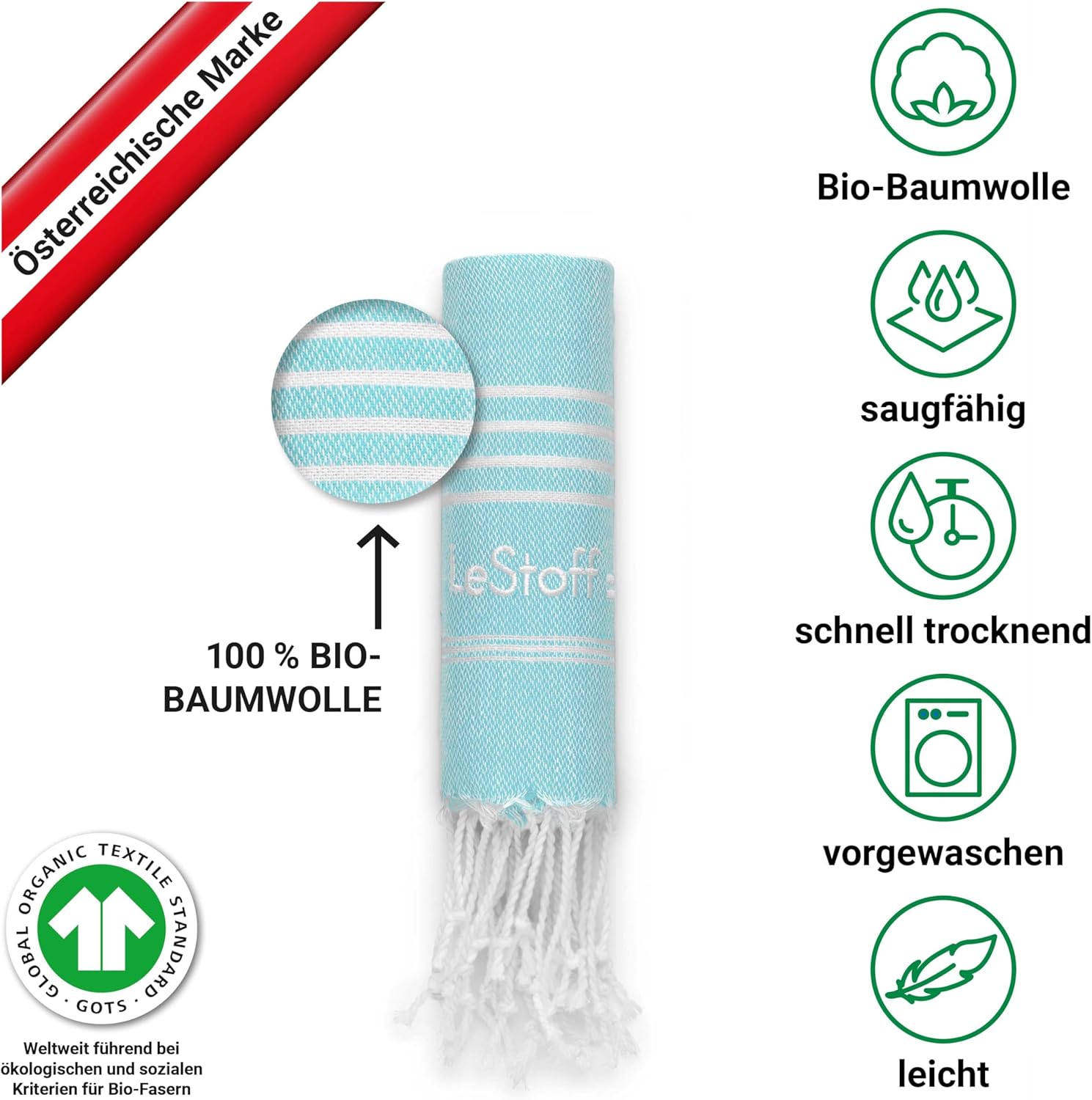 LeStoff Premium Hammam кърпа 50 x 100 см - 100% органичен памук, предварително прана, устойчива, лека, компактна, абсорбираща, бързосъхнеща, кърпа за баня, гости, лице, спорт, пътуване, къмпинг (аквамарин)