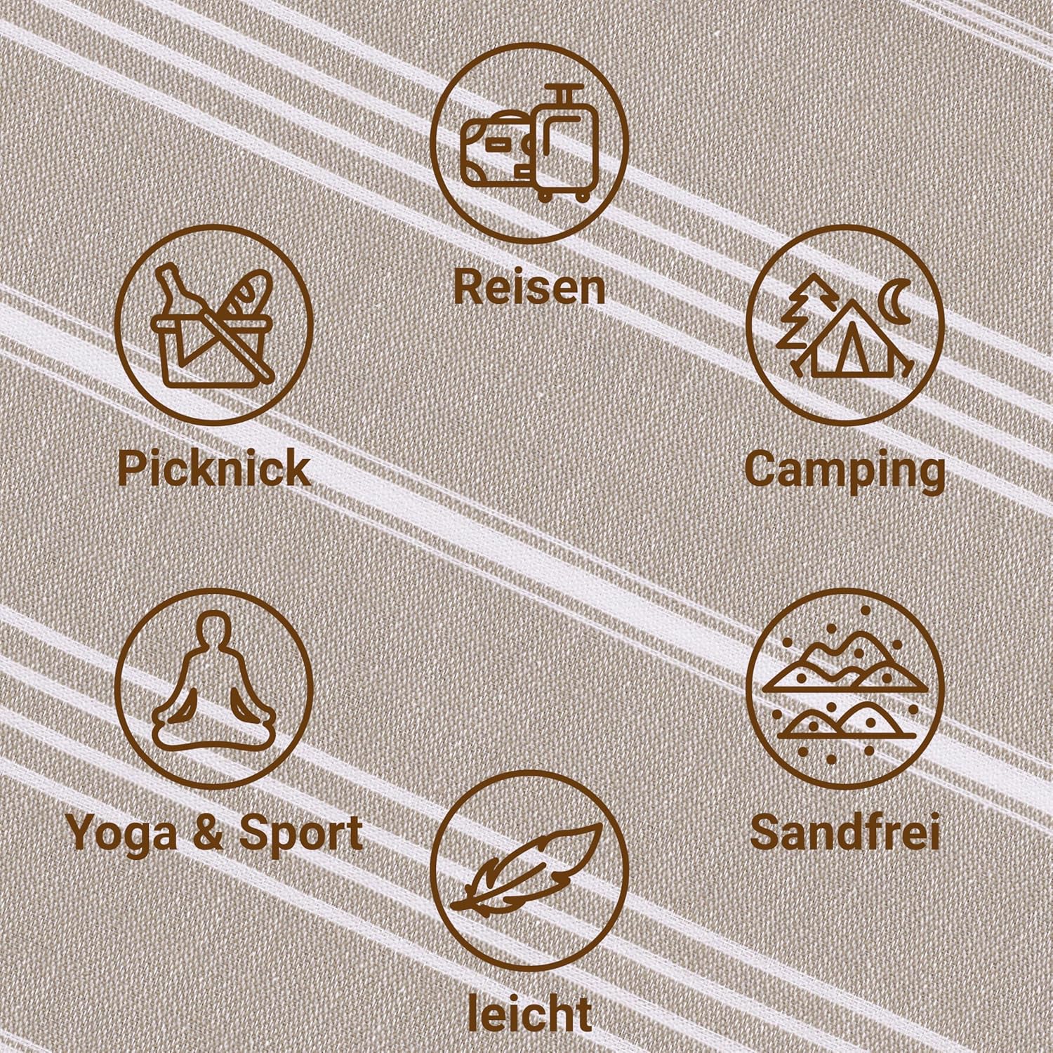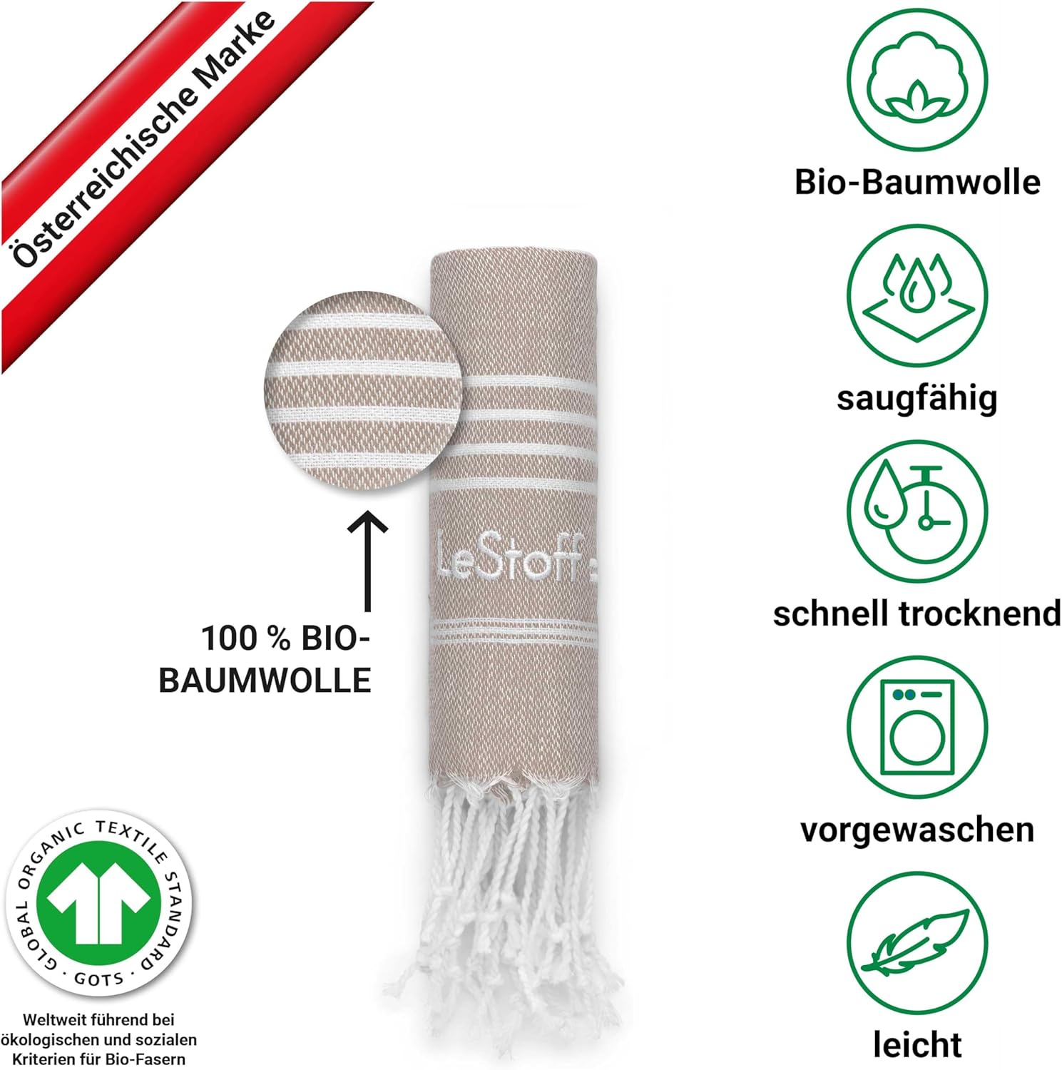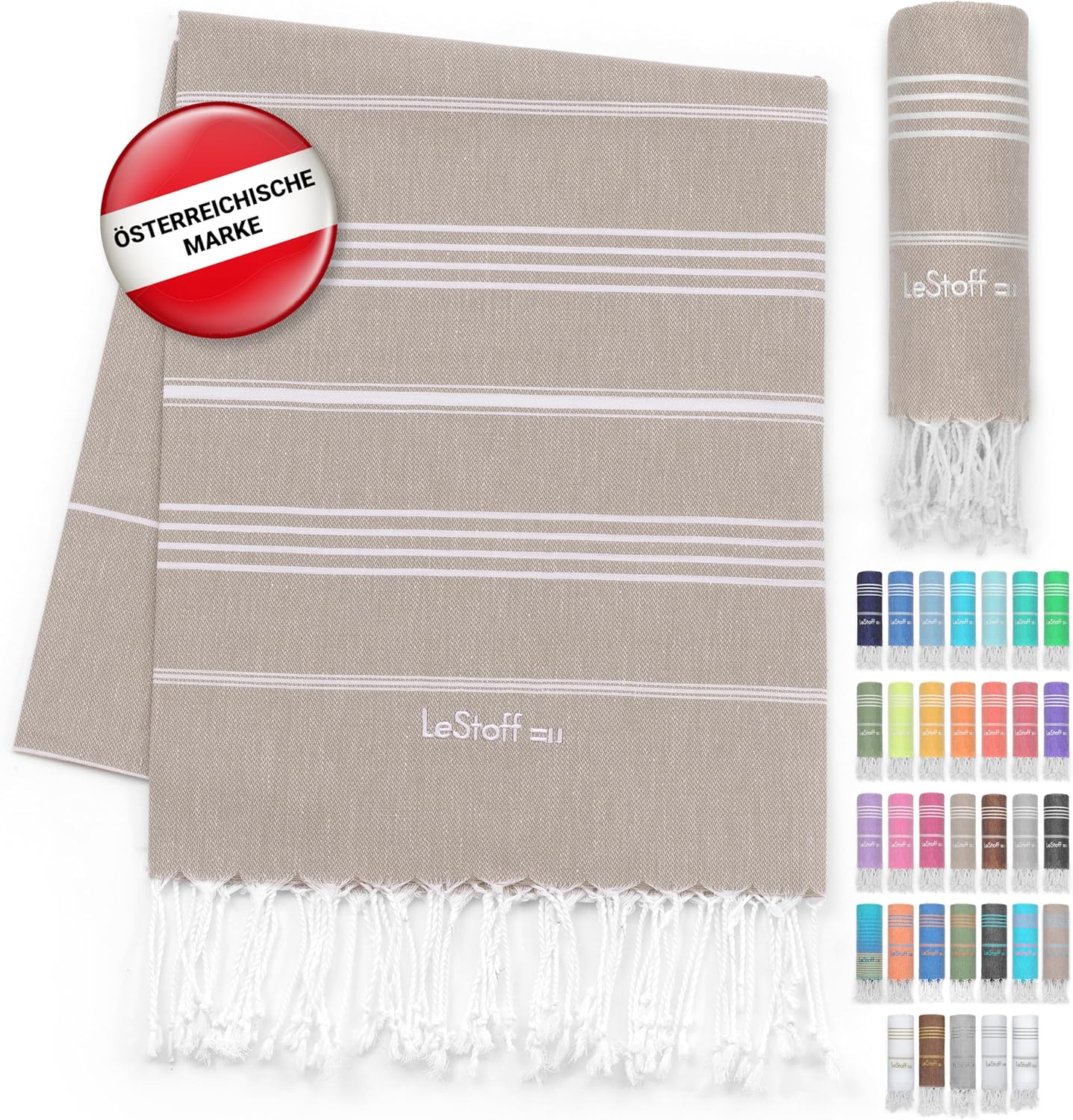 • Многофункционална: независимо дали за сушене, като плажна кърпа, кърпа за сауна, спортна кърпа, кърпа за баня или кърпа за йога – нашата хамам кърпа LeStoff впечатлява със своята многофункционалност. Идеална за пътуване, защото благодарение на лекотата си и възможността за навиване, тя е перфектната кърпа за пътуване и къмпинг.