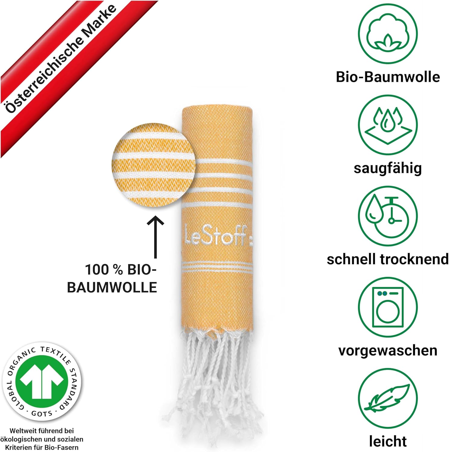 • Многофункционална: независимо дали за сушене, като плажна кърпа, кърпа за сауна, спортна кърпа, кърпа за баня или кърпа за йога – нашата хамам кърпа LeStoff впечатлява със своята многофункционалност. Идеална за пътуване, защото благодарение на лекотата си и възможността за навиване, тя е перфектната кърпа за пътуване и къмпинг.