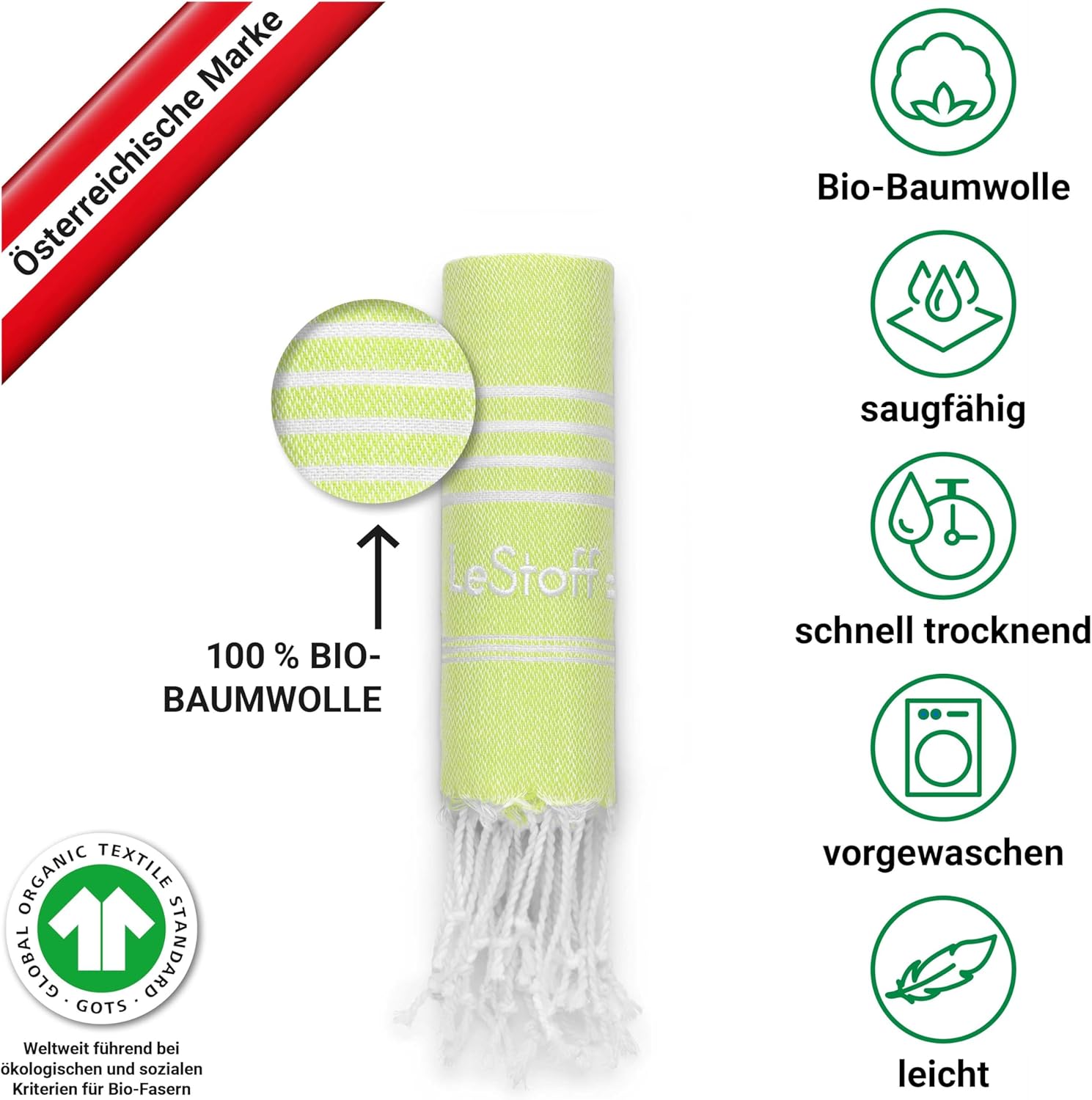 LeStoff Premium Hammam кърпа 50 x 100 см - 100% органичен памук, предварително прана, устойчива, лека, компактна, абсорбираща и бързосъхнеща - кърпа за баня, гости, лице, спорт, пътуване, къмпинг (лайм)