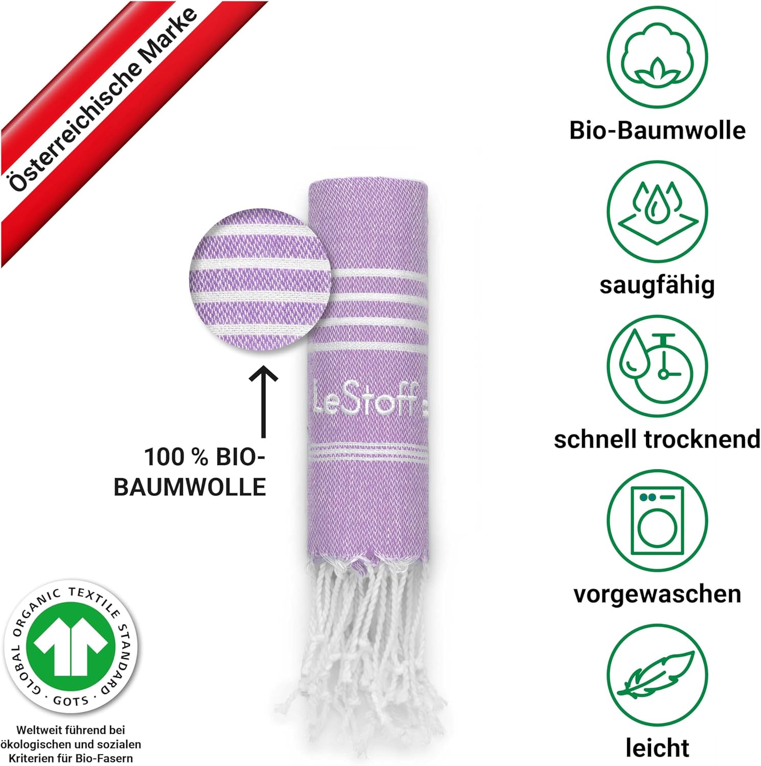 LeStoff Premium Hammam кърпа 50 x 100 см - 100% органичен памук, предварително прана, устойчива, лека, компактна, абсорбираща и бързосъхнеща - кърпа за баня, гости, лице, спорт, пътуване, къмпинг (лилава)