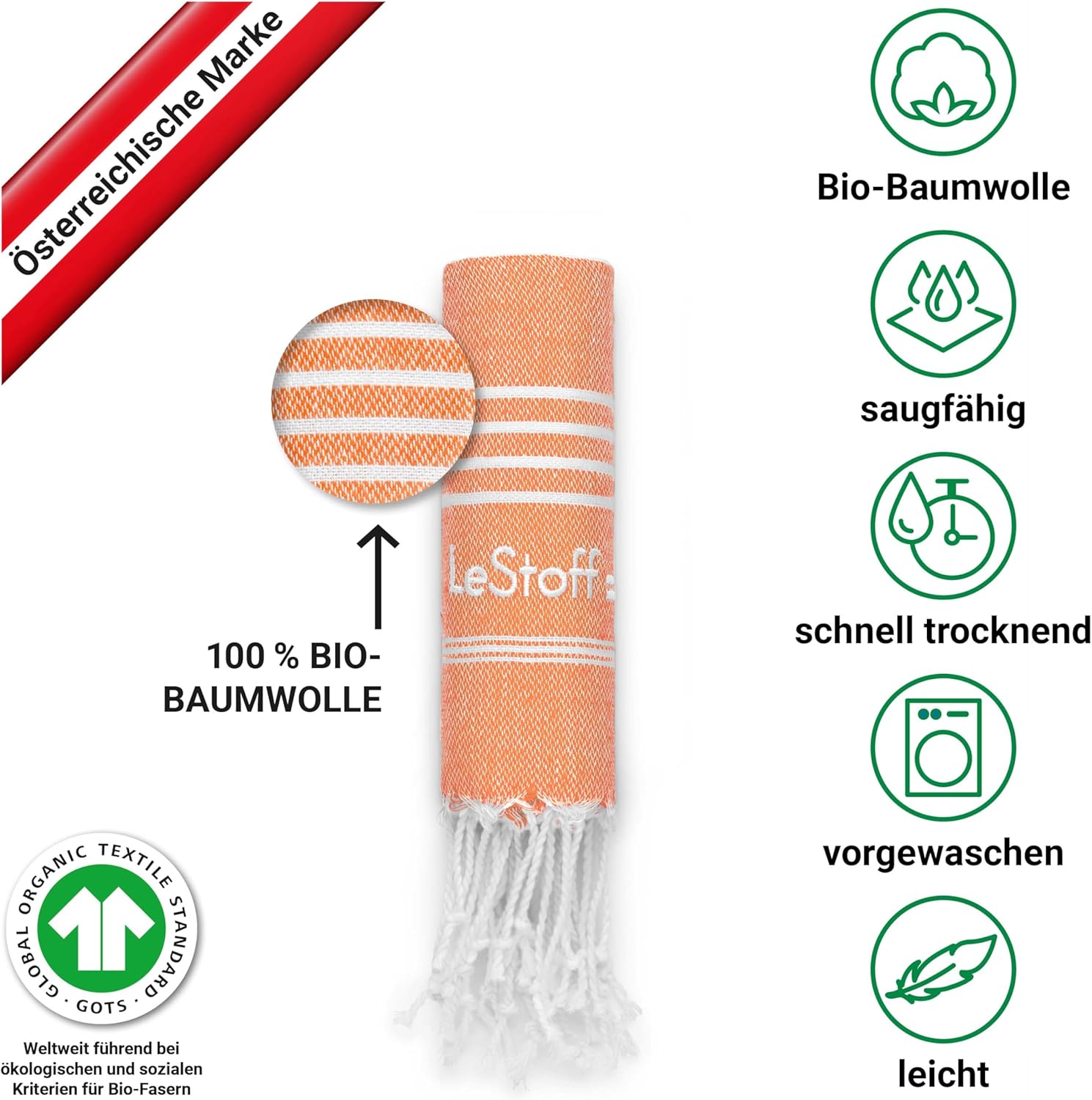 LeStoff Premium Hammam кърпа 50 x 100 см - 100% органичен памук, предварително прана, устойчива, лека, компактна, абсорбираща и бързосъхнеща - кърпа за баня, гости, лице, спорт, пътуване, къмпинг (оранжева)