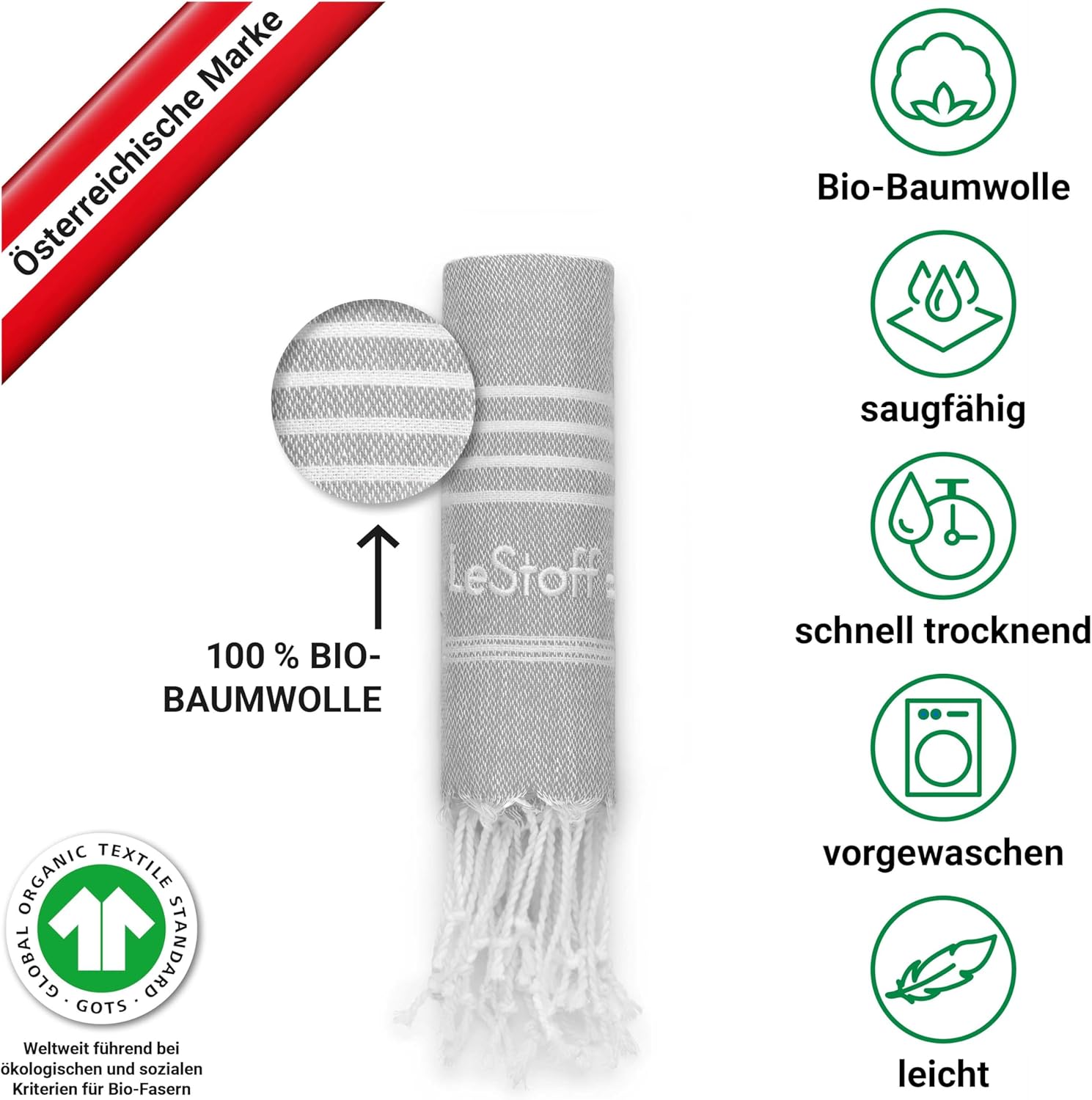 • Многофункционална: независимо дали за сушене, като плажна кърпа, кърпа за сауна, спортна кърпа, кърпа за баня или кърпа за йога – нашата хамам кърпа LeStoff впечатлява със своята многофункционалност. Идеална за пътуване, защото благодарение на лекотата си и възможността за навиване, тя е перфектната кърпа за пътуване и къмпинг.