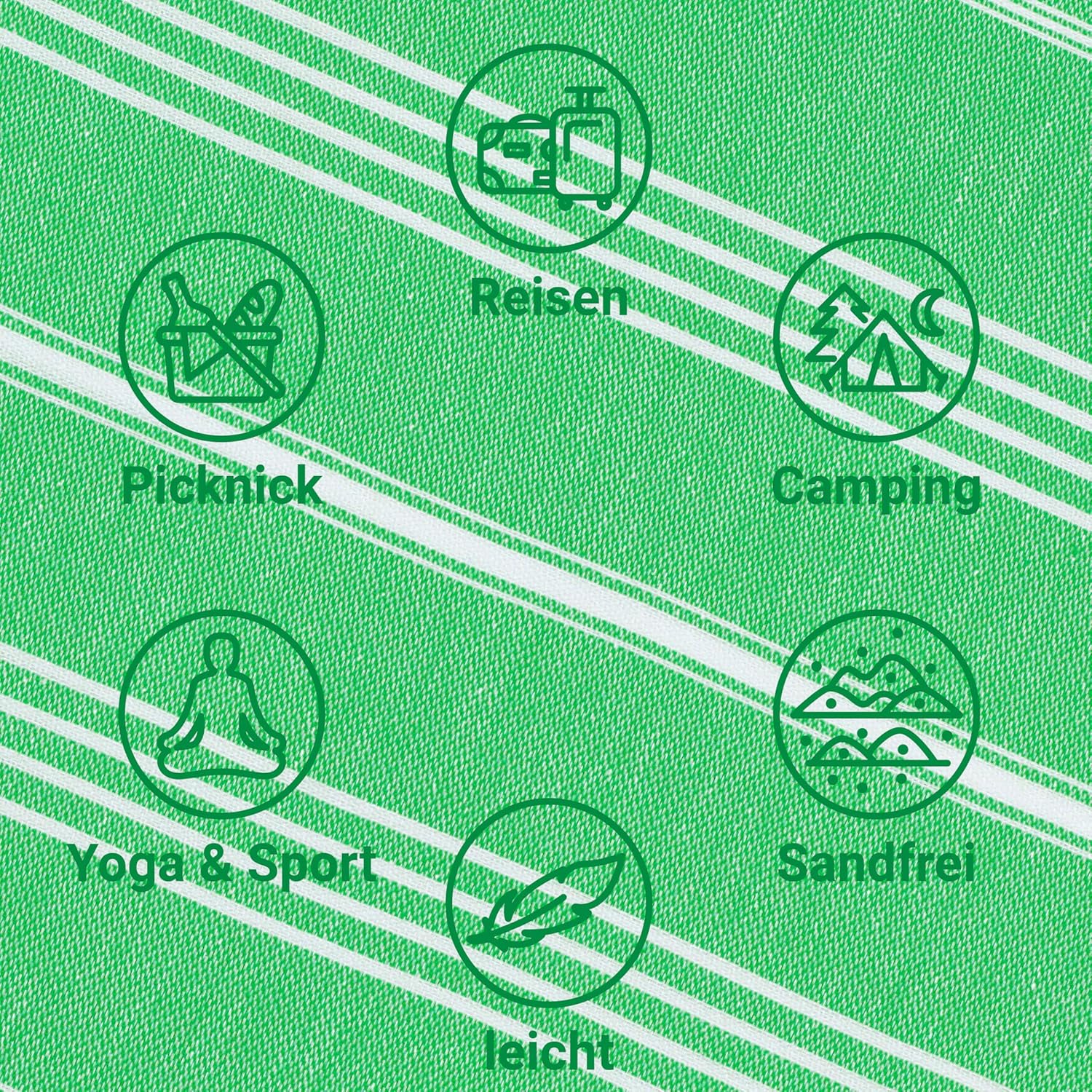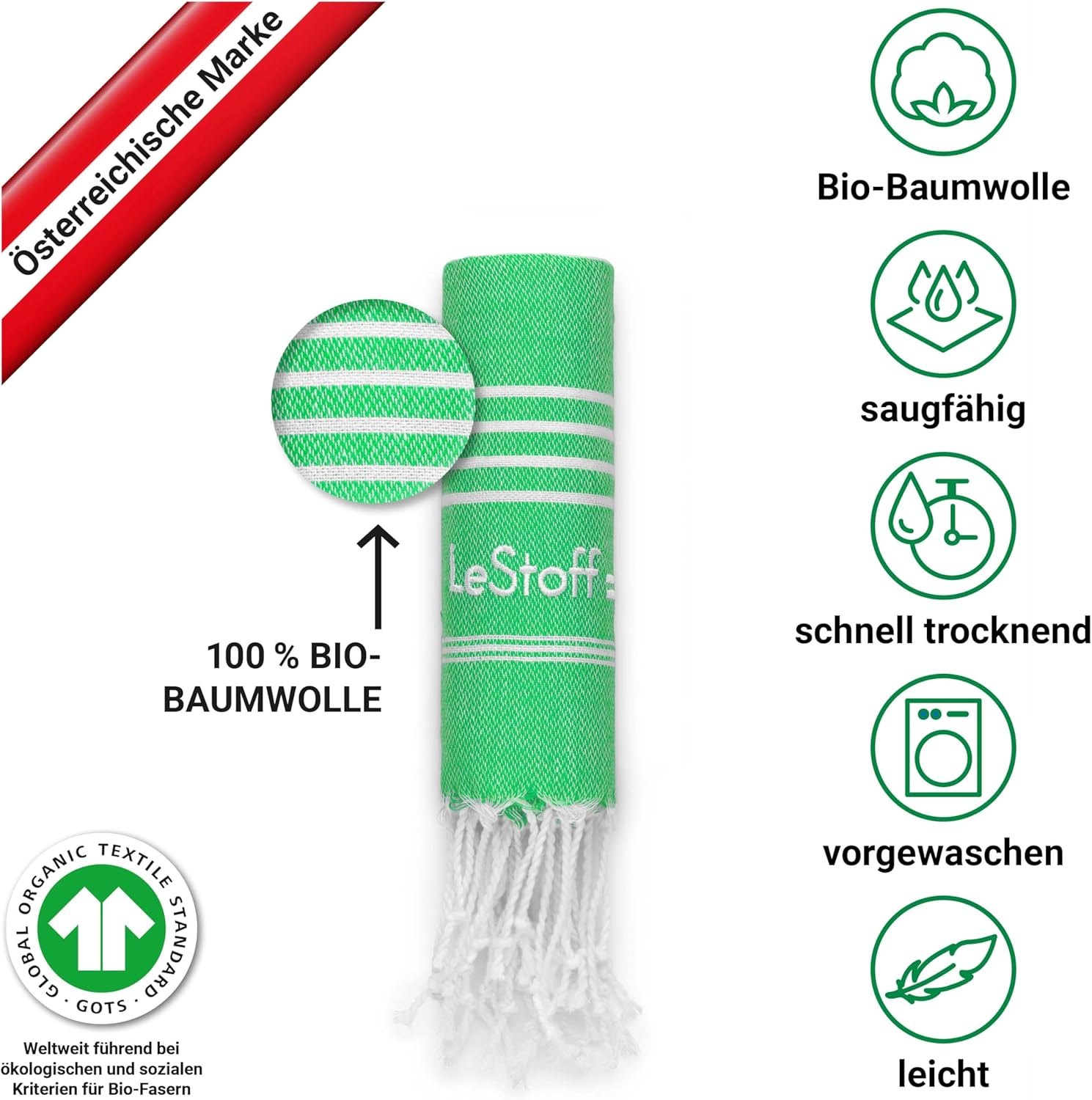• Многофункционална: независимо дали за сушене, като плажна кърпа, кърпа за сауна, спортна кърпа, кърпа за баня или кърпа за йога – нашата хамам кърпа LeStoff впечатлява със своята многофункционалност. Идеална за пътуване, защото благодарение на лекотата си и възможността за навиване, тя е перфектната кърпа за пътуване и къмпинг.