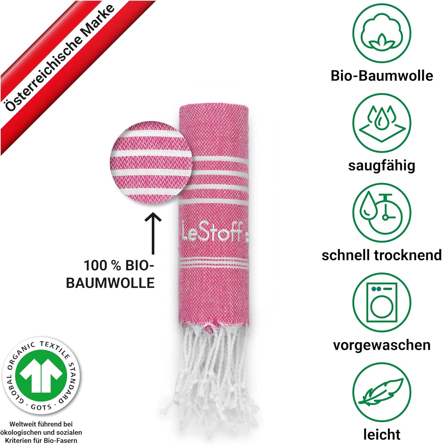 LeStoff Традиционна хамам кърпа, плажна кърпа, кърпа за баня, кърпа за сауна, спа, спорт, йога, пътуване, 100% органичен памук, устойчива, естествена, мека и предварително изпрана (50 x 100 см, фуксия)
