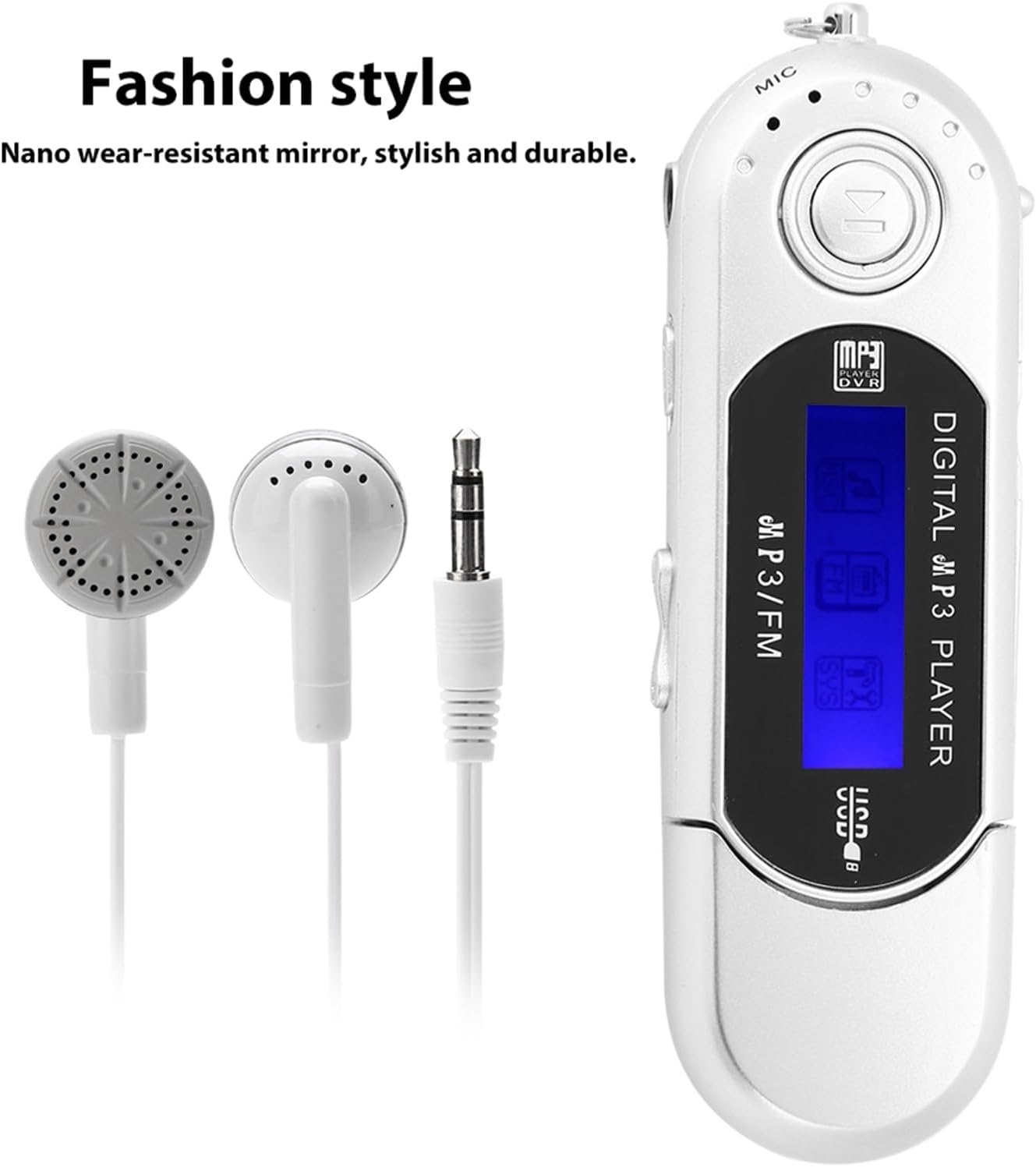 Формат на възпроизвеждане: MP3 Батерия: 1 x AAA батерия (не е включена). USB: USB 2.0 Цвят: Черен, Сребрист, Син (по избор) Поддържа до 32GB Micro SD/карта с памет (паметта не е включена)
