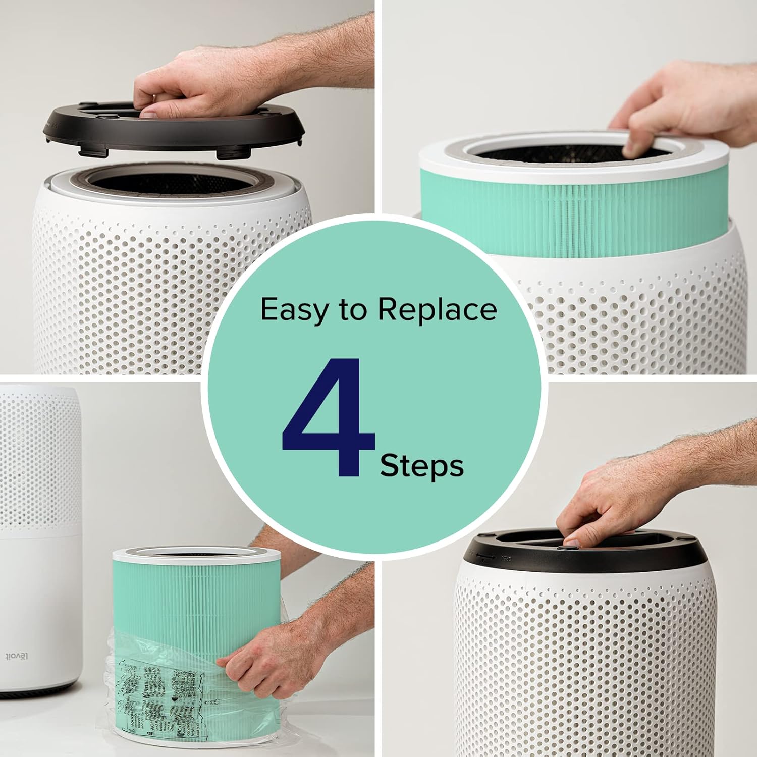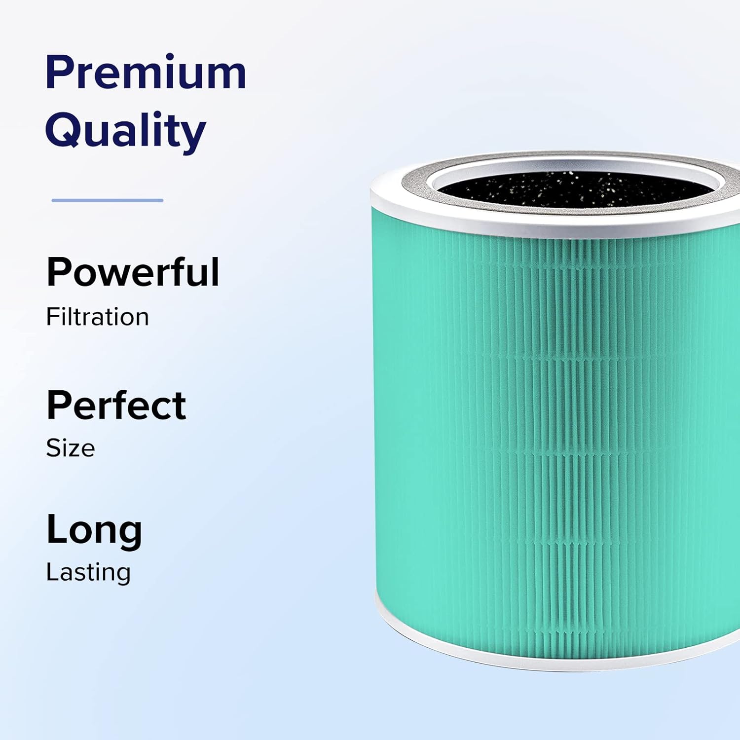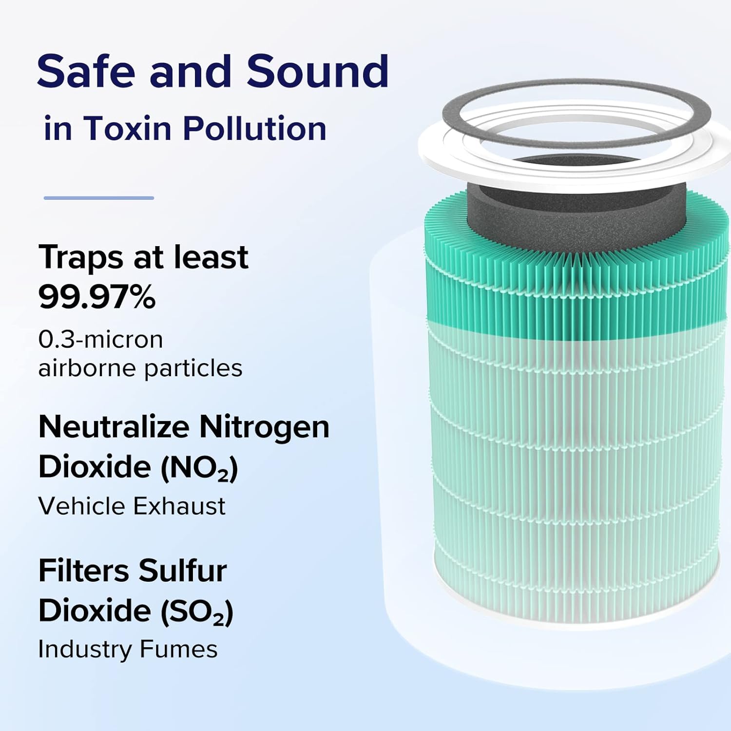 • 3 нива на филтрация: Състои се от фин предфилтър, H13 HEPA филтър и филтър с активен въглен. Премахва 99,97% прах, полени, дим, миризми и косми от домашни любимци. Филтрира също частици с размер до 0,3 микрона и филтрира замърсяването на въздуха от PM 2,5. Идеален за страдащи от алергии, астматици, собственици на домашни любимци, пушачи и деца.