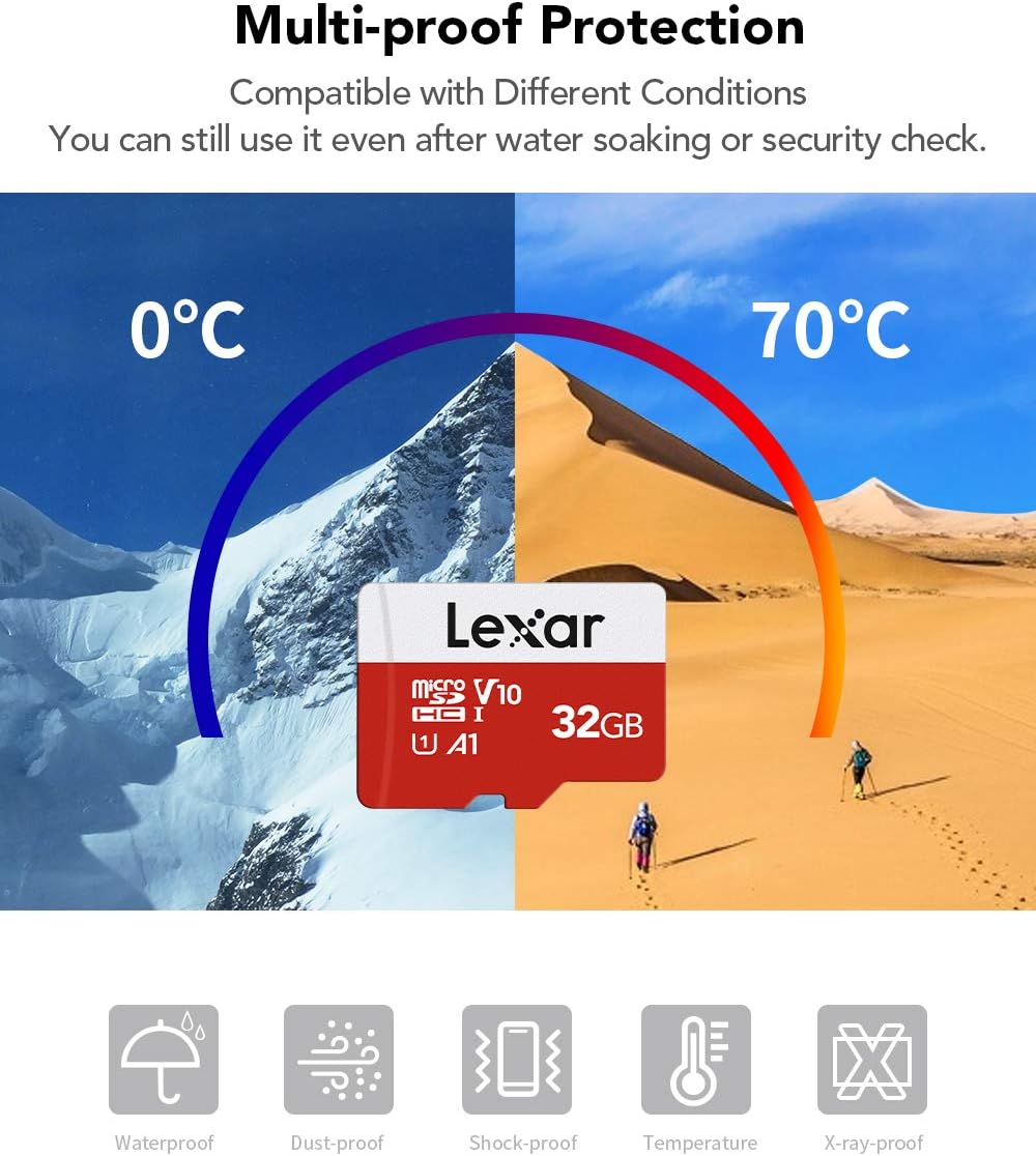 • Картата памет Lexar microSDHC е удароустойчива, водоустойчива, температуроустойчива, устойчива на рентгенови лъчи и магнитно поле. Не се притеснявайте, ако micro SD картата не е налична, след като преминете през рентгеново устройство за сигурност. Работна температура: от -25°C до 85°C. 10 години ограничена гаранция.