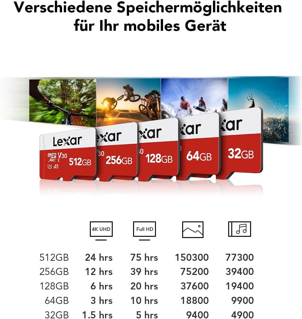 • Картата Lexar Micro SD с капацитет 32 GB поддържа скорост на четене до 100 MB/s и стандартна скорост на запис за пренос на данни. (Въз основа на вътрешната тестова среда на Lexar, така че действителната скорост може да варира в зависимост от устройството и хост средата.)